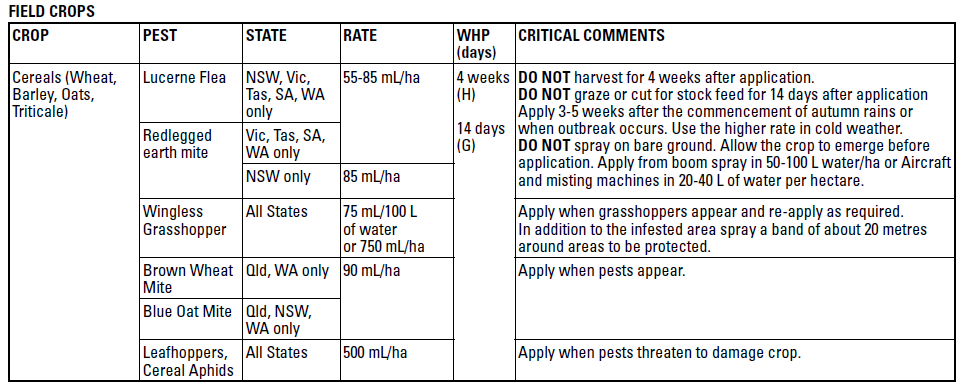 Example of a small segment of a product label; application rates and restrictions can vary between pests, crops and even states. Always ensure that your spray parameters are applicable to your situation, and that you keep appropriate records of all spray operations.