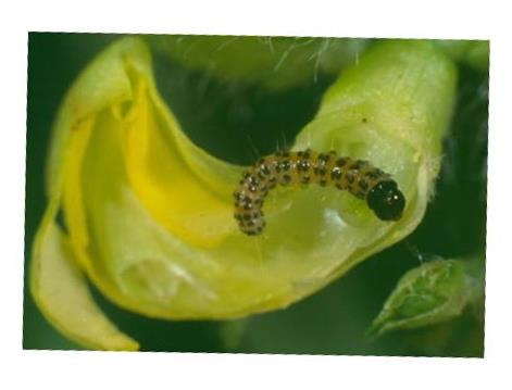 - Small bean podborer larva in flower (2nd instar 5 mm) – note prominent spots