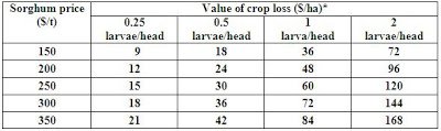 Table: The value of crop loss caused by corn earworm larvae in grain sorghum, for a range of larval densities and grain prices and based on 10 heads/metre of row on 1 metre row spacing.