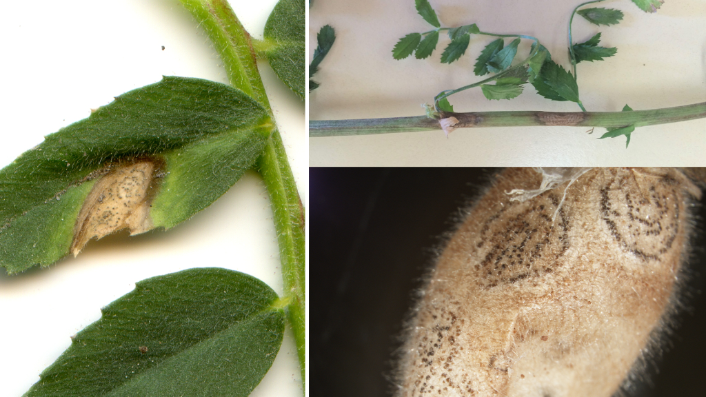 Ascochyta blight causes spots on chickpea leaves, stems and pods