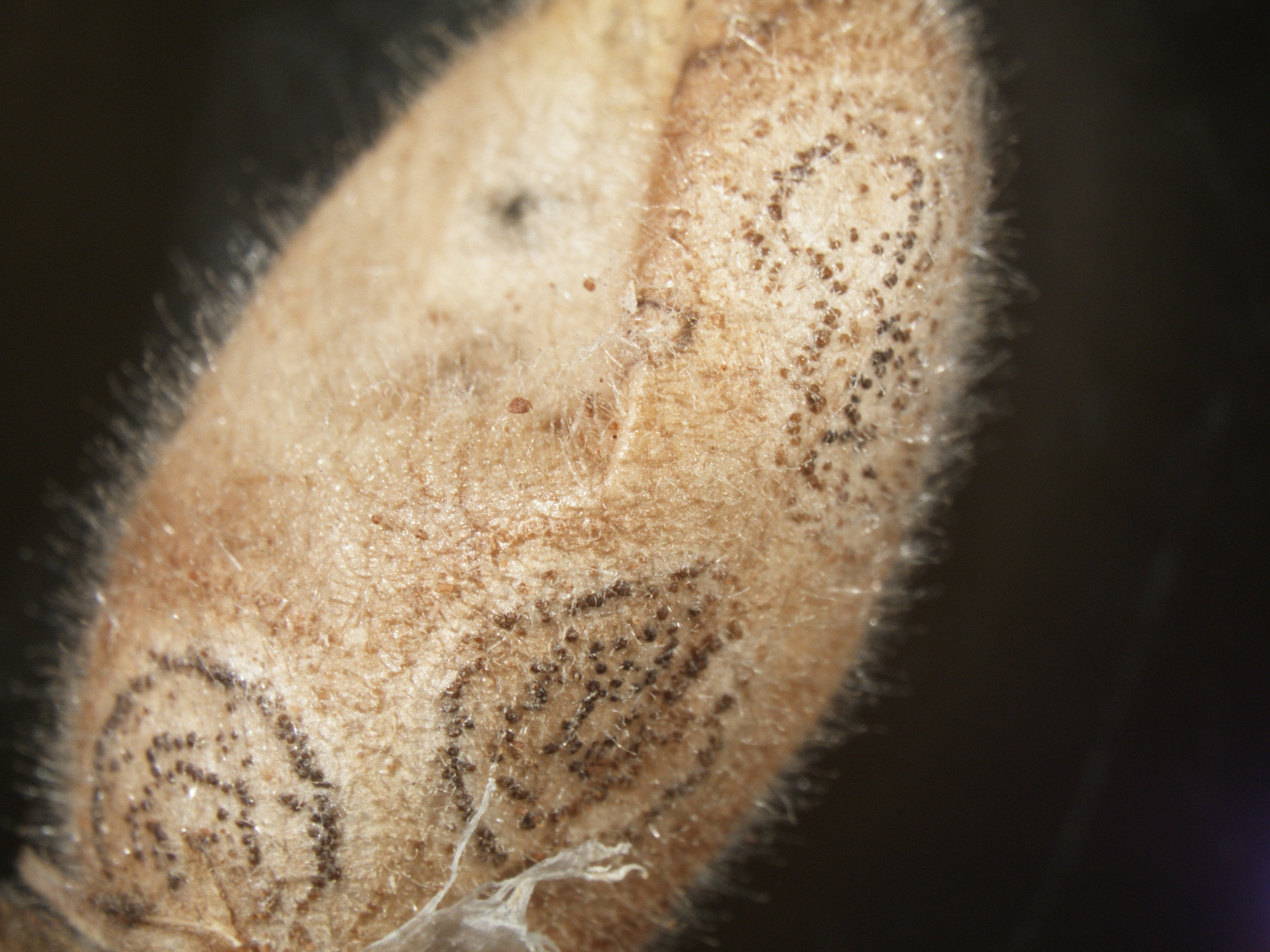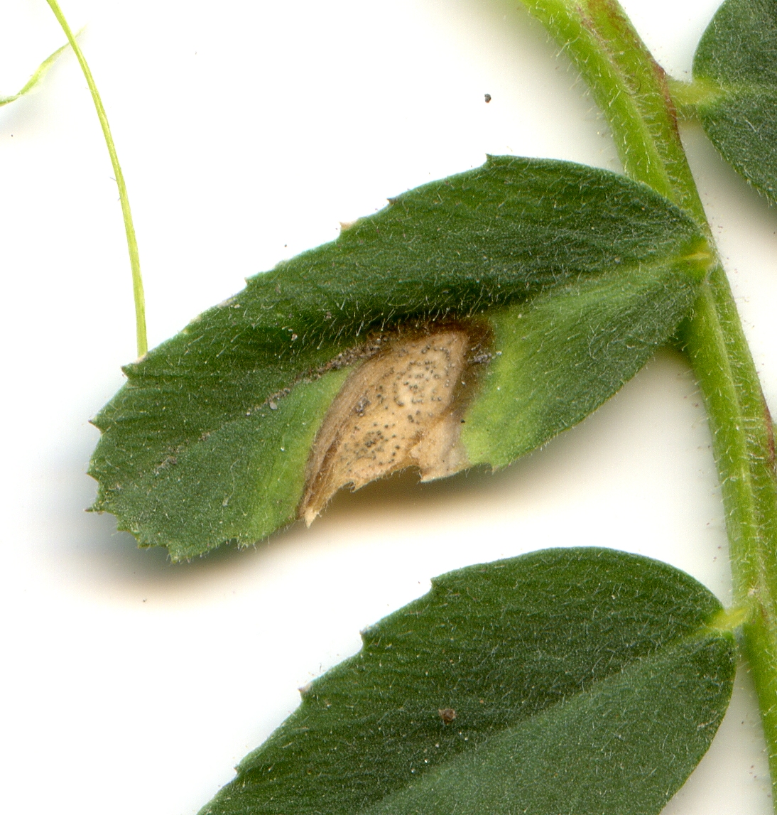 - Fungal fruiting bodies visible on chickpea leaf spots caused by Ascochyta blight