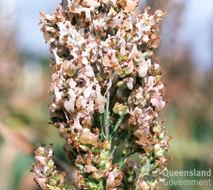 - Brown mouldy fungal growth evident on sorghum panicles with grain mould