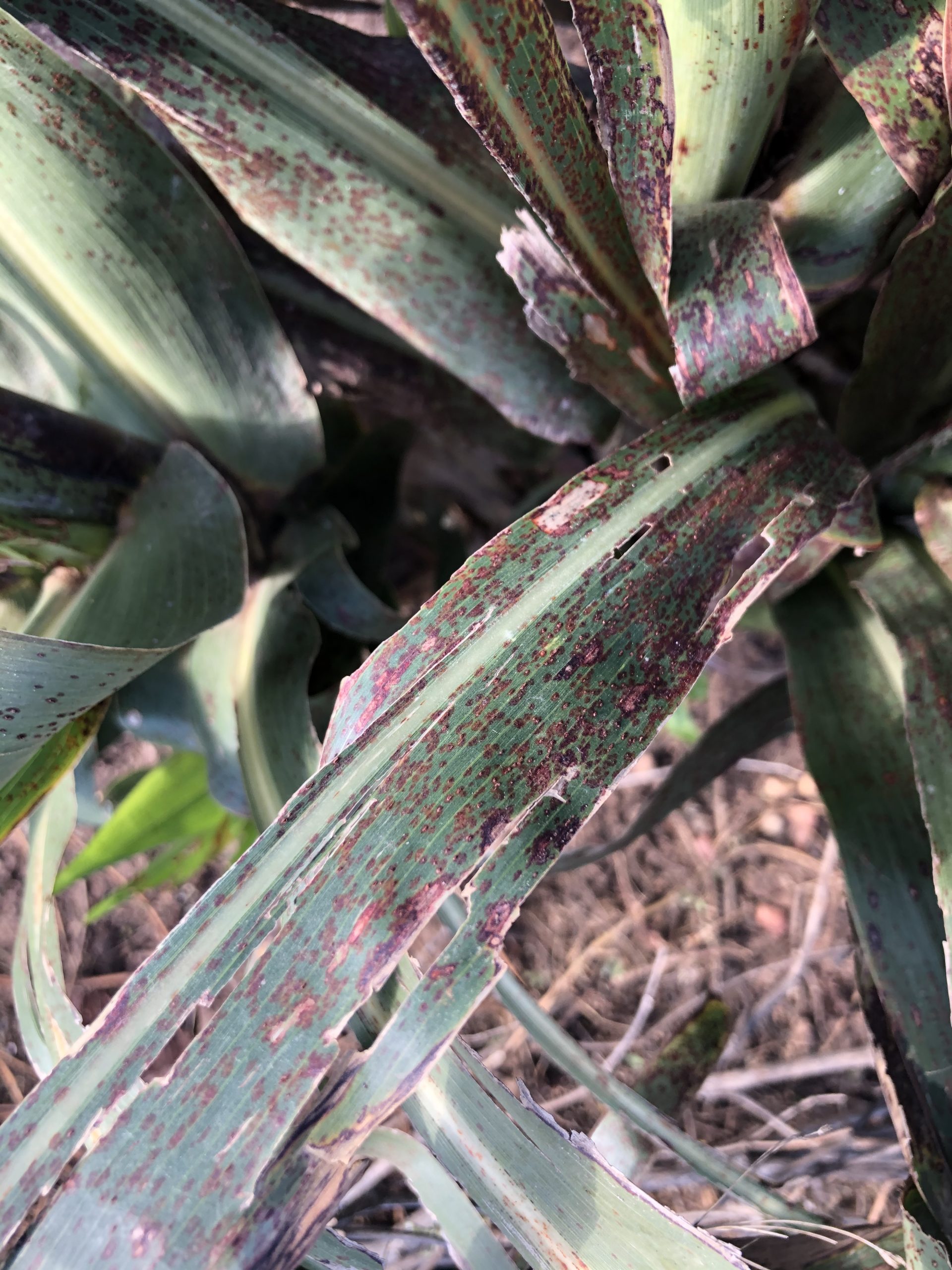 - Sorghum leaf with reddish-brown rust pustules