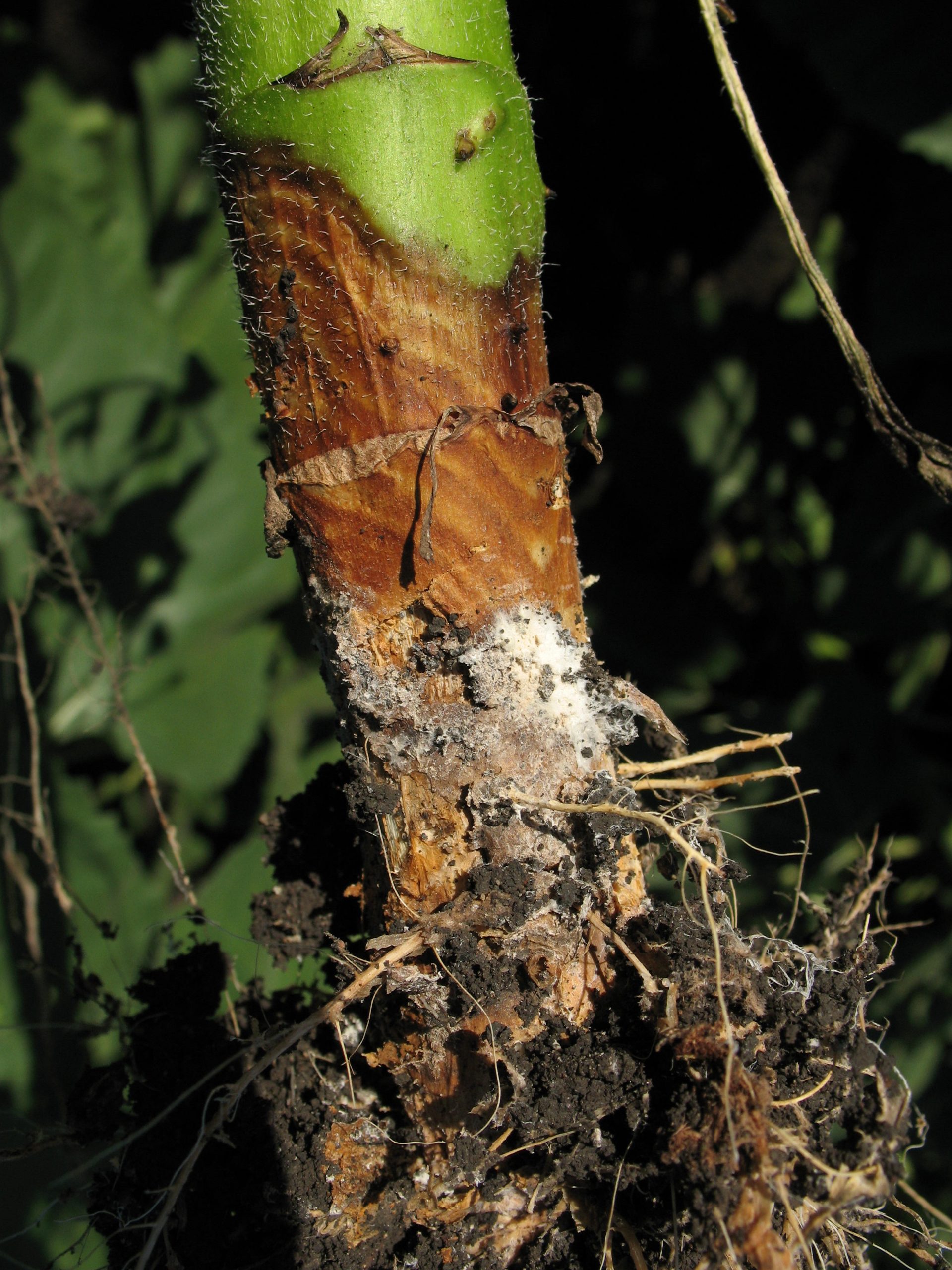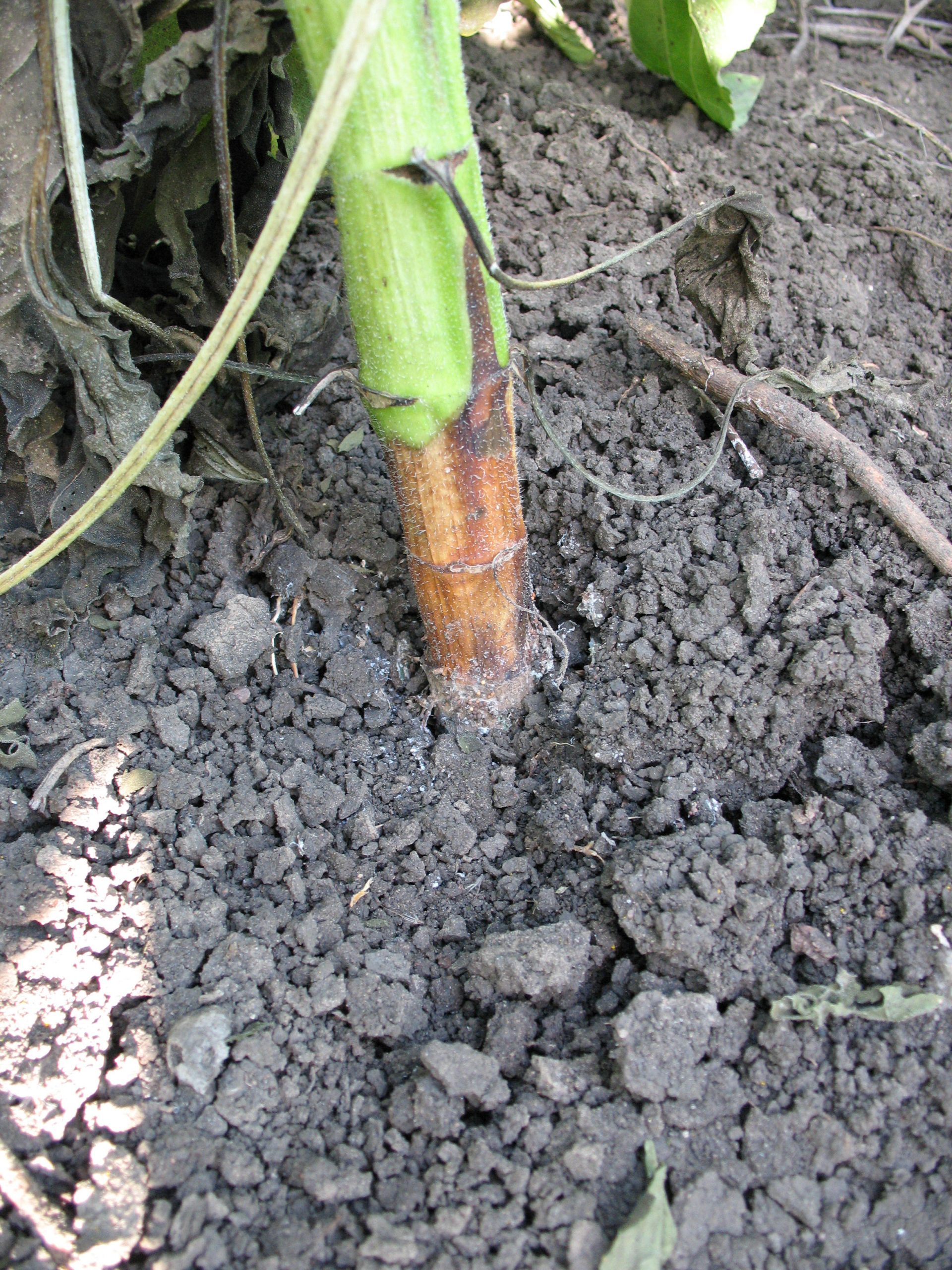 - White fungal growth on basal lesion of sunflower plant with stem rot