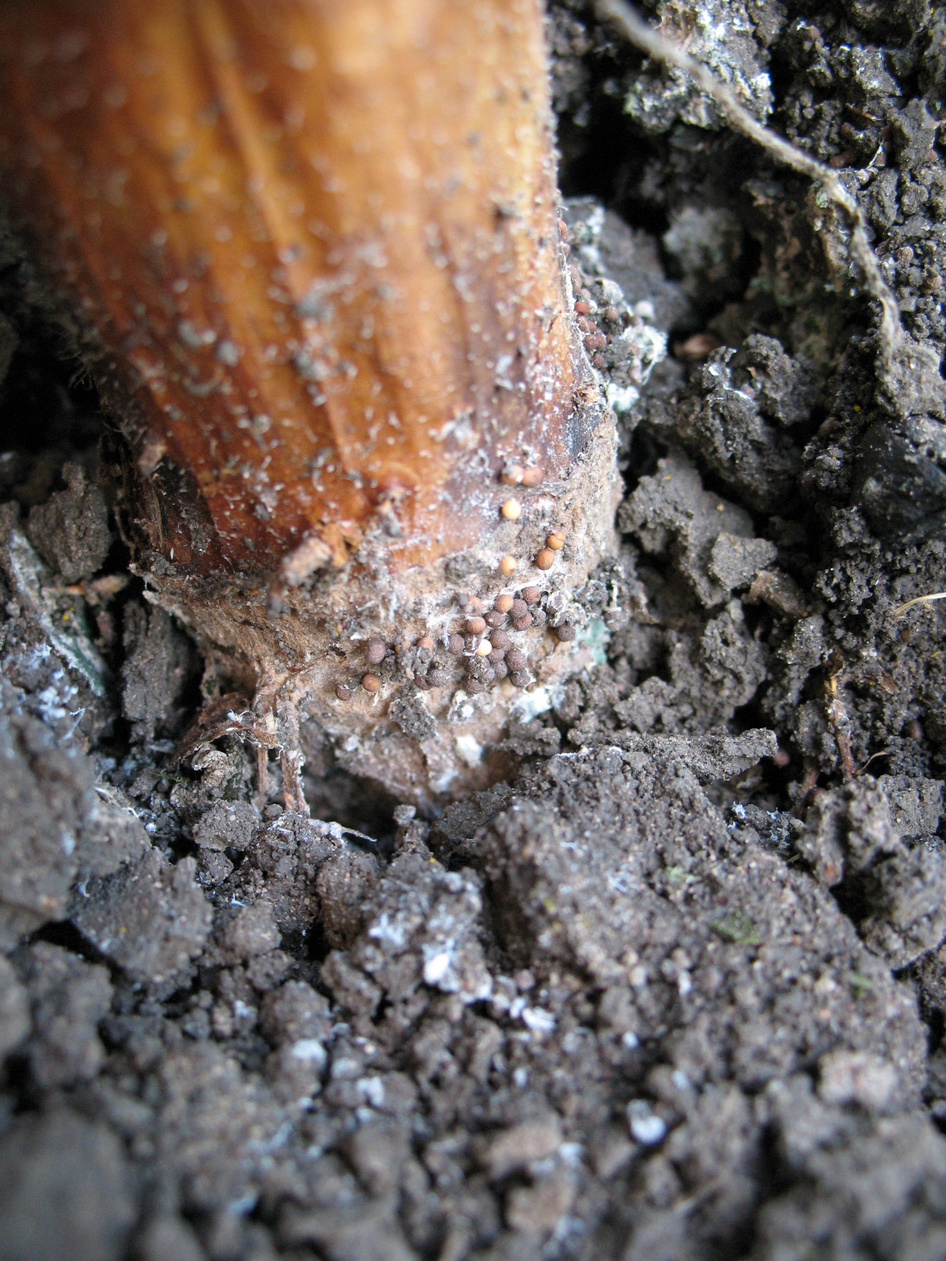 - Tan coloured sclerotia of Sclerotium rolfsii in infected sunflower plant
