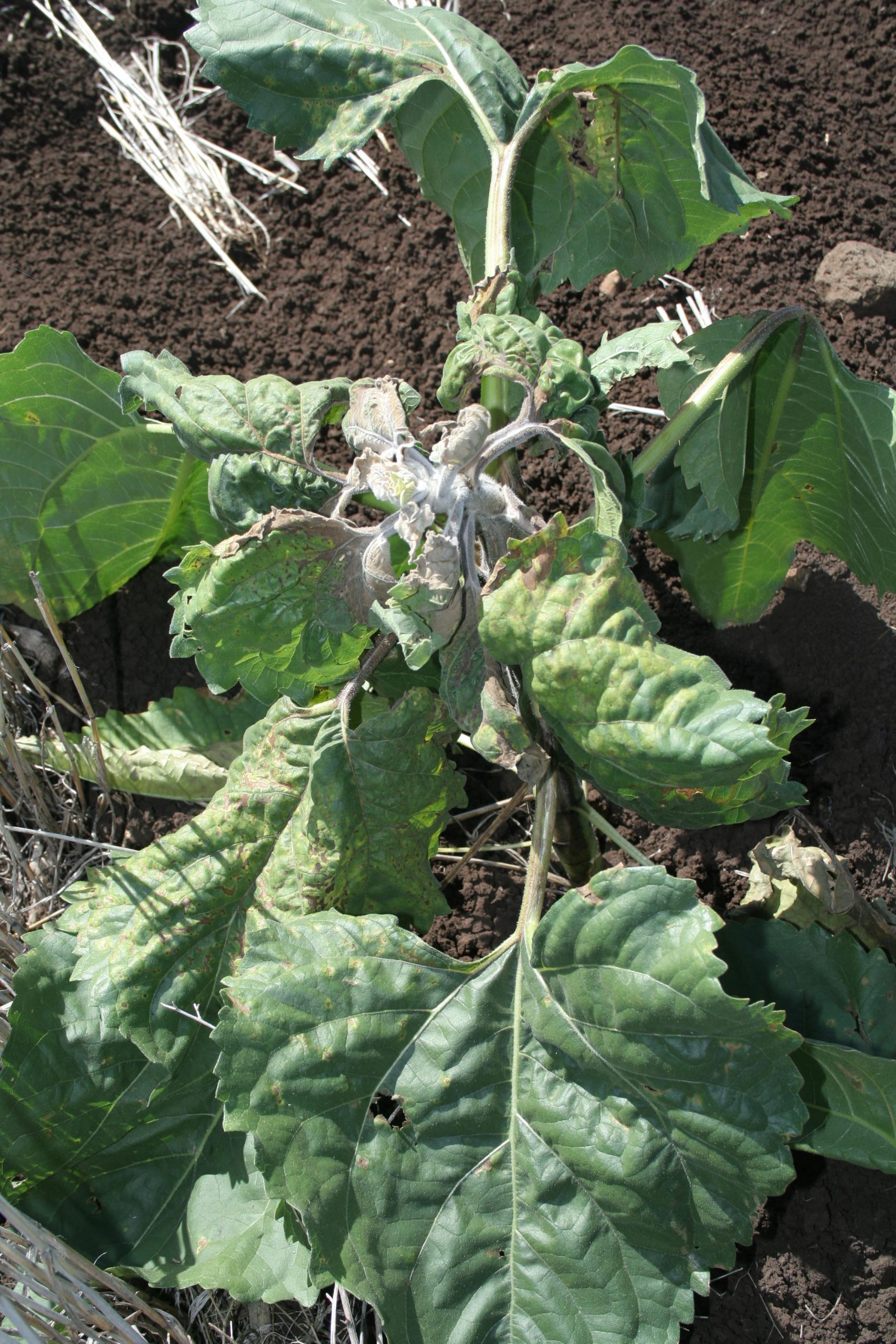 - Terminal necrosis and chlorosis on leaves of sunflower infected with TSV