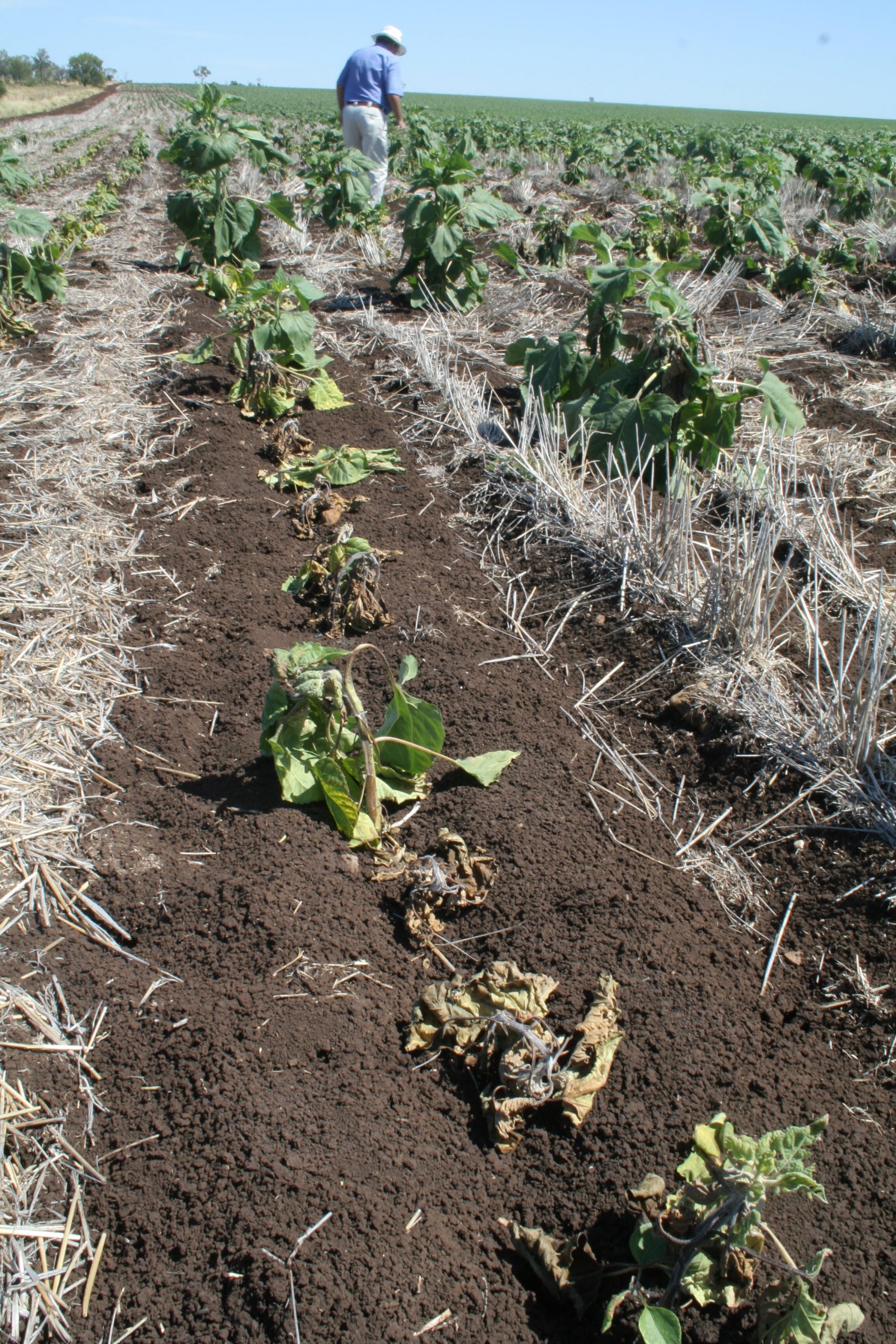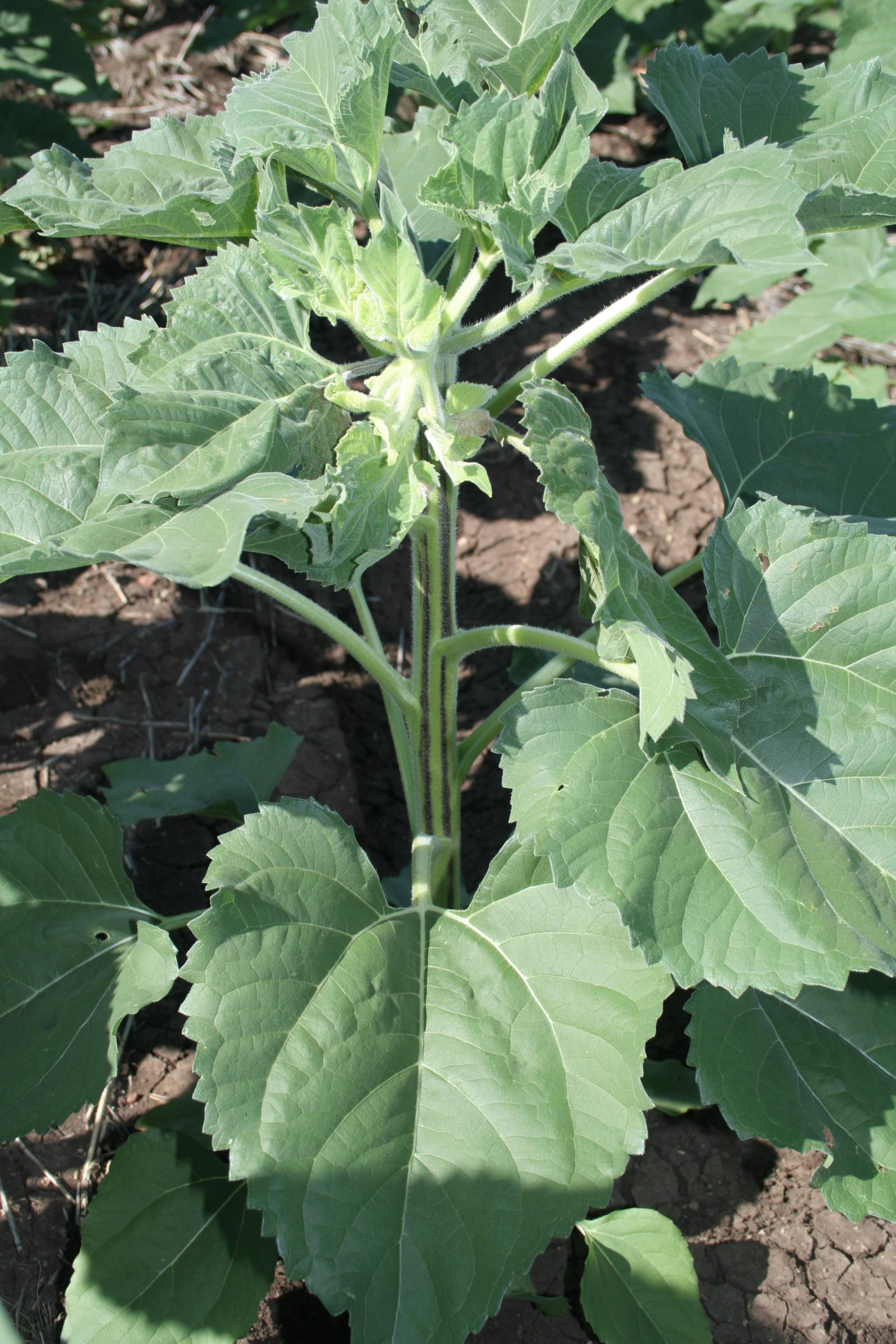 - Terminal necrosis and streaks on stem of sunflower infected with TSV