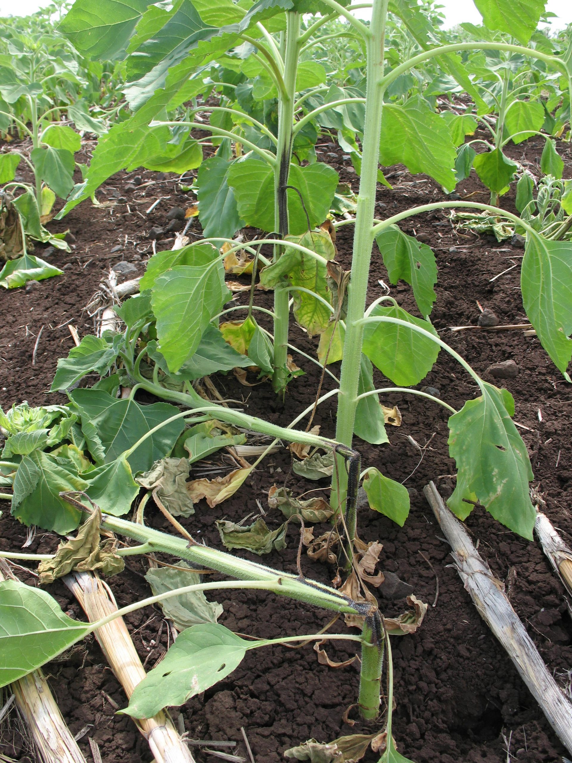 - Necrotic streaks on stem of sunflower and lodging of plants infected with TSV
