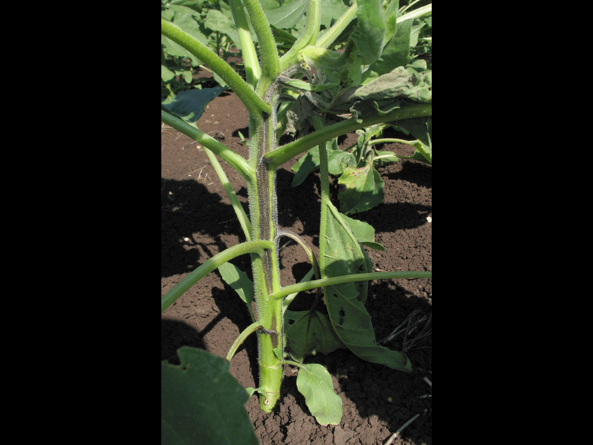 - Necrotic streaks on stem of sunflower infected with TSV