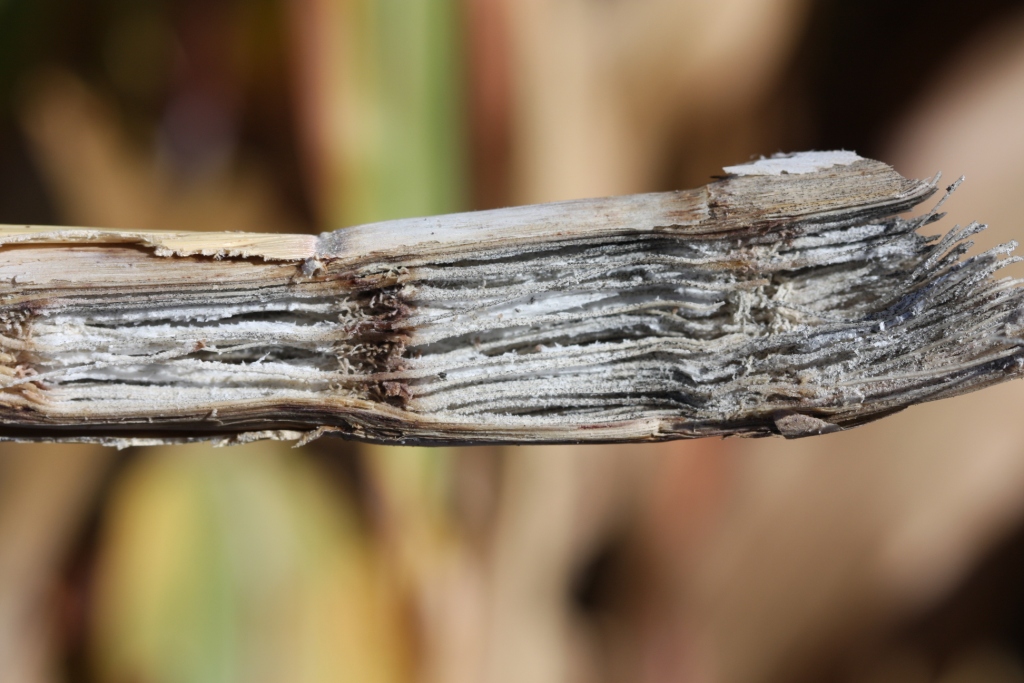 - Internal stalk tissue shreds as a result of charcoal rot infection