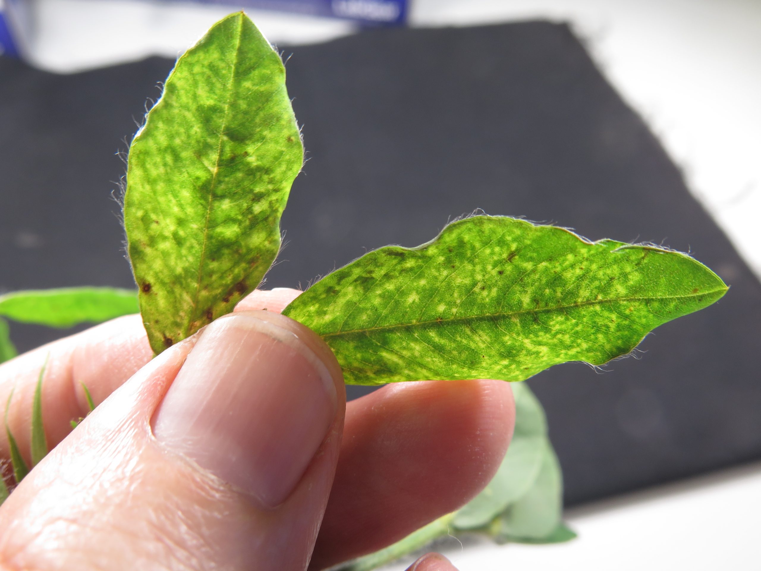 - Small chlorotic spots and mild leaf distortion on peanut infected with CPMMV