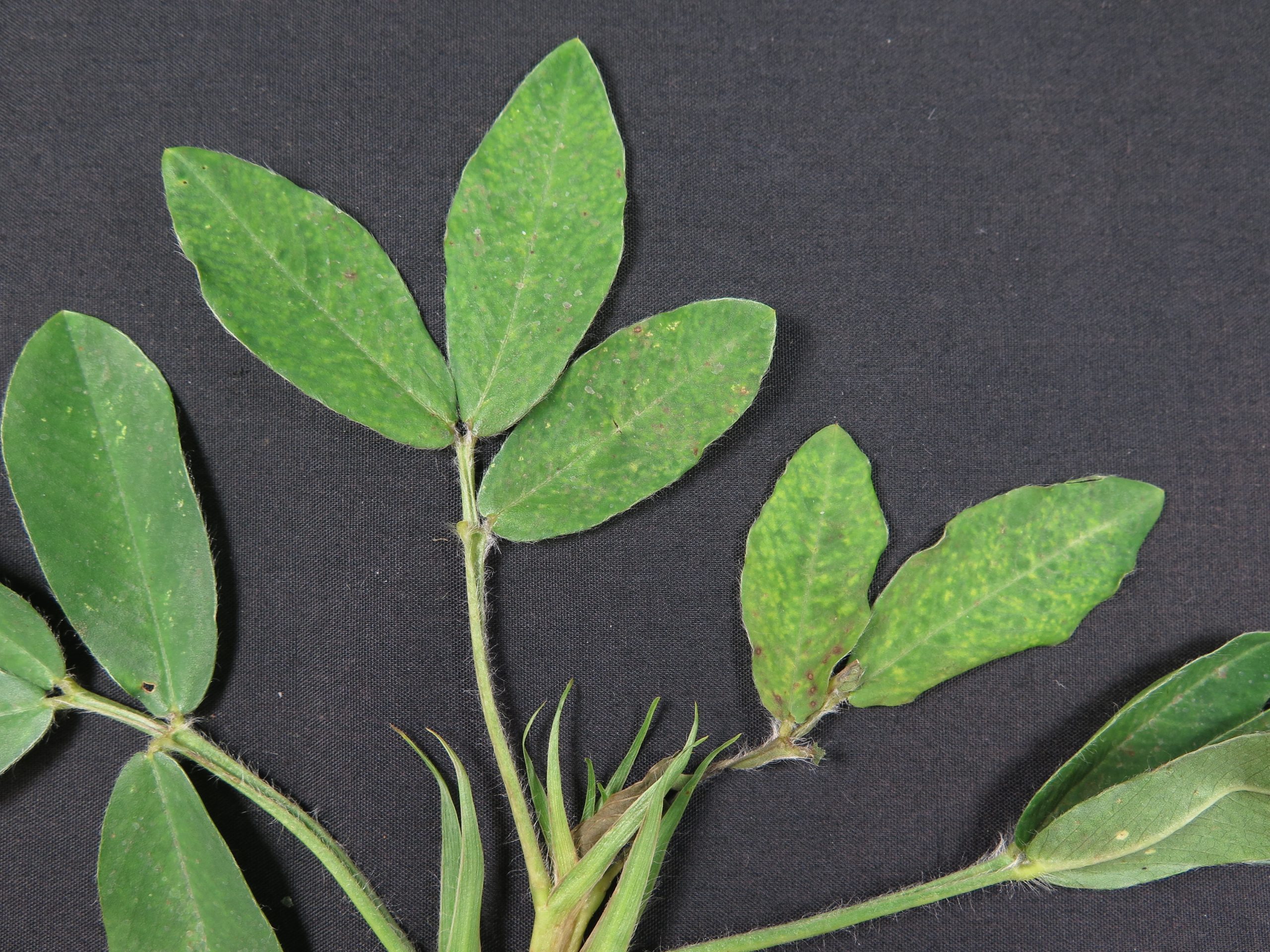 - Small chlorotic spots, mild leaf distortion and petiole necrosis on peanut infected with CPMMV