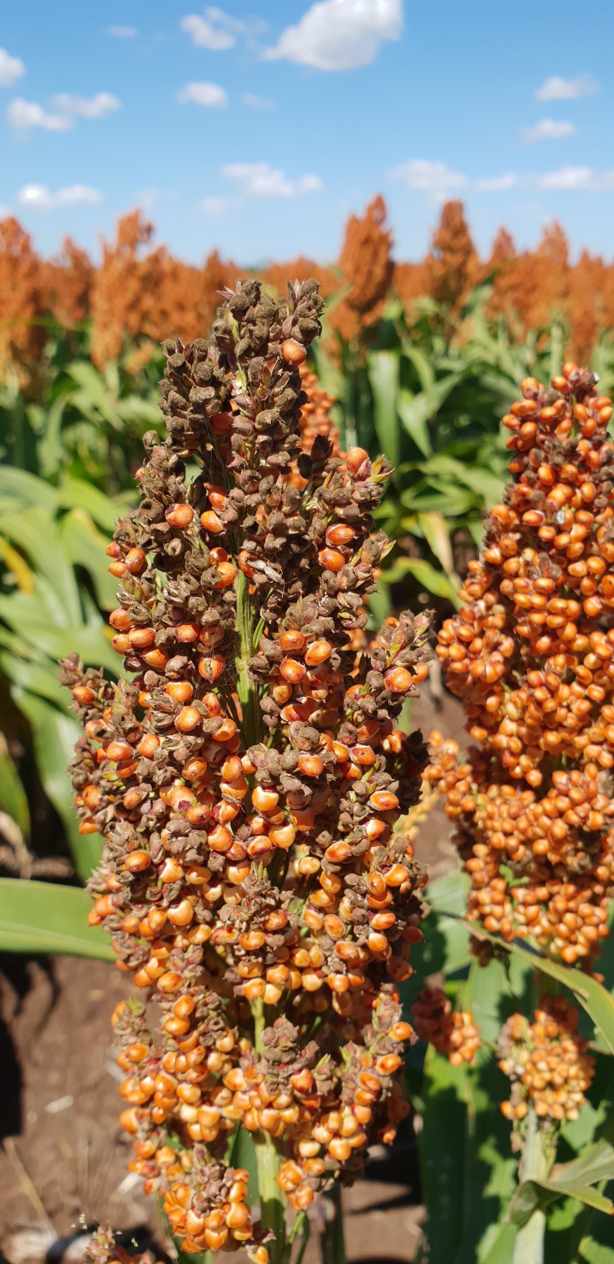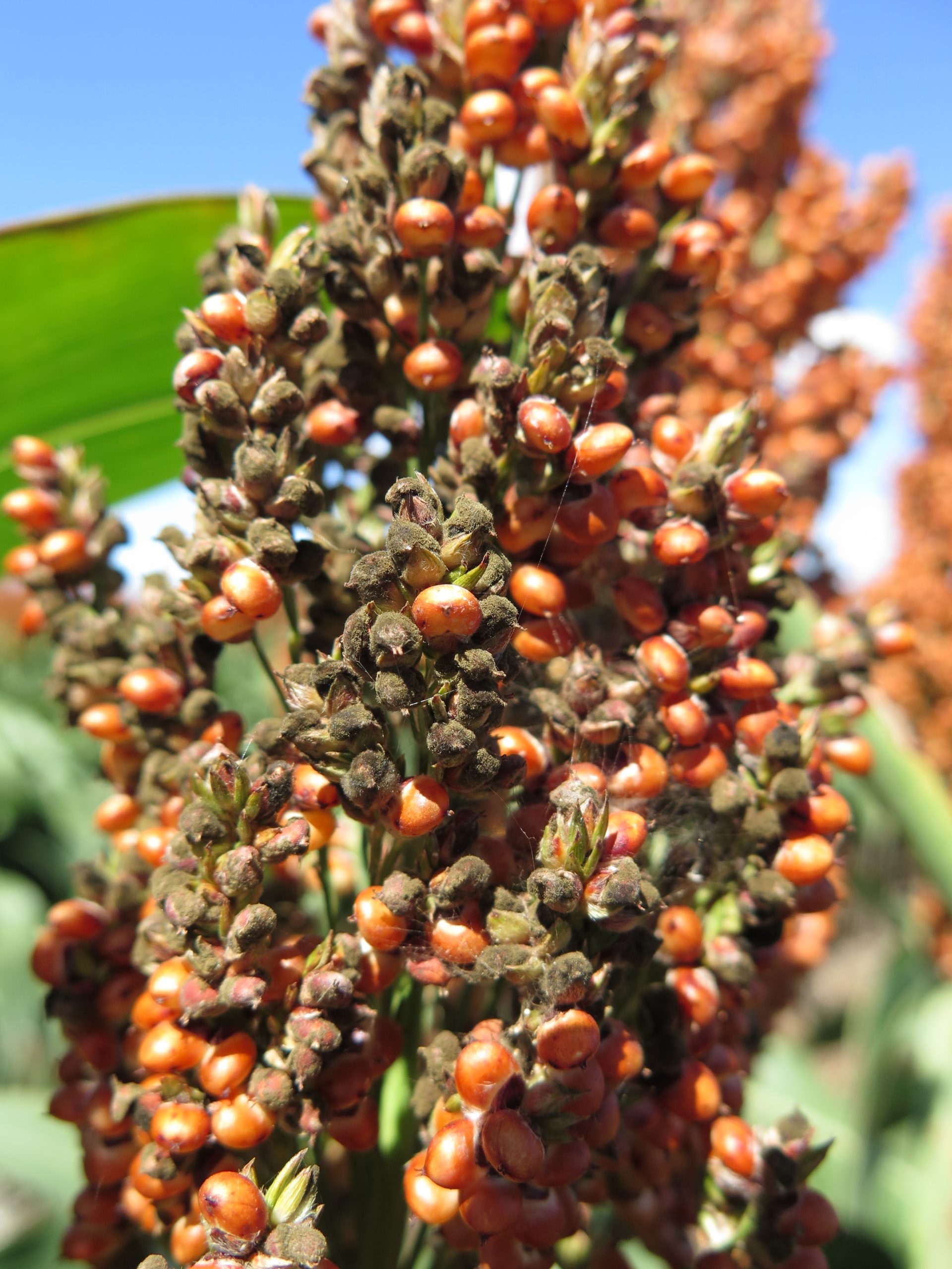 - Brown mouldy fungal growth evident on sorghum panicles with grain mould