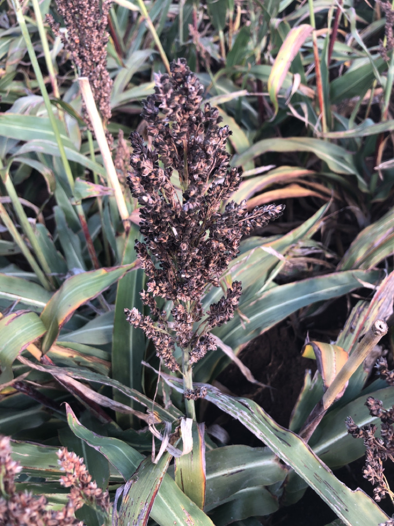 - Dark mouldy fungal growth on sorghum panicles with grain mould