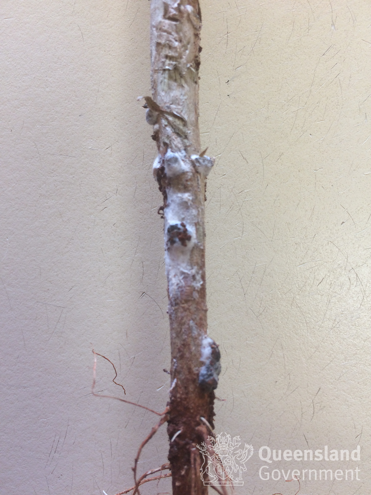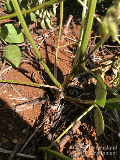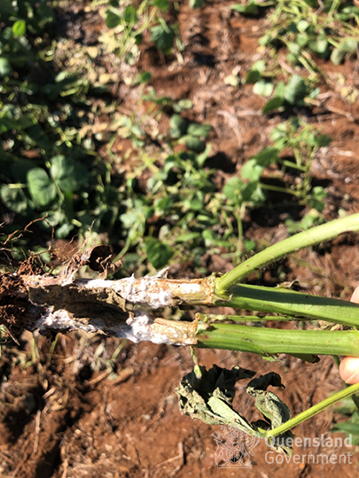 - White fungal growth on basal stem of mungbean plants with Sclerotinia