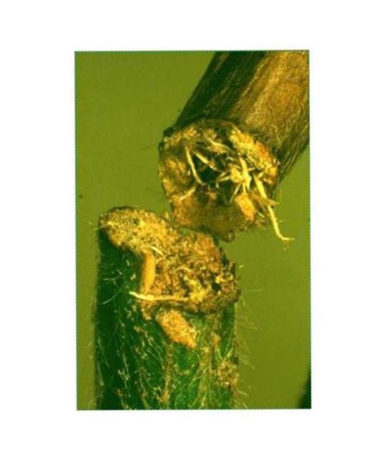 Girdling occurs when stem-boring larvae nearing pupation ringbark the plant’s stem internally, severing the vascular tissue. They then use this tissue to plug the stem’s pith canal, thus creating a secure overwintering chamber in the tap root.