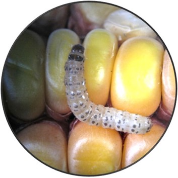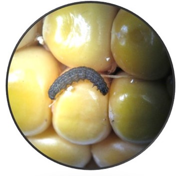 Late maturing cob in July and large FAW larva (23 mm) feeding inside this cob. Note the fall armyworm’s ‘greasy’ appearance (their colour can vary).