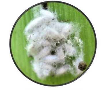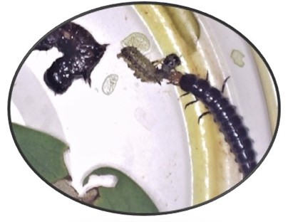 Pictured above: pupae of Cotesia sp., a small wasp that can parasitise a single armyworm larva with 20 or more larvae, which visibly pupate beside their dying host, and right: a carab beetle larva attacking a small FAW larva, after killing a much larger FAW larva.
