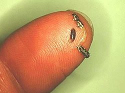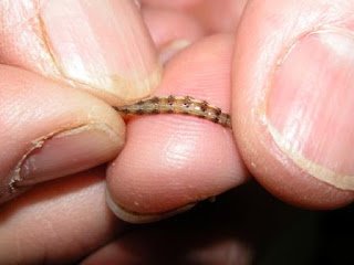 In the field, parasitised caterpillars can be identified by performing a simple split test. Parasitised caterpillars will only grow to about 15 mm in length, so caterpillars smaller than this are potentially Microplitis hosts. Hold a caterpillar across a forefinger with one thumb and forefinger on the rear end of the caterpillar, and with the other thumb on the head. Gently stretch the caterpillar until the skin ruptures. A Microplitis larva developing within the caterpillar looks like a white maggot up to 4 mm long.