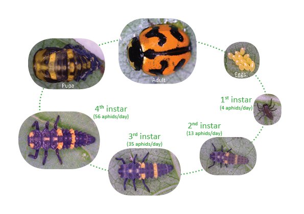 When ladybird beetles commence reproduction (mating pairs or eggs can be seen in the crop), it often means aphid populations will be suppressed over the coming weeks, as the larvae develop. The example lifecycle below shows approximately how many aphids are consumed by each larval stage. Development from egg to adult usually takes about 20 days.