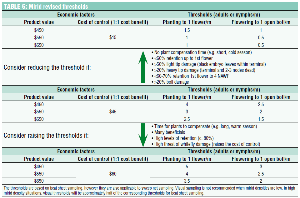 Revised economic thresholds and associated guidelines for controlling mirids (2018-19 Cotton Pest Management Guide).