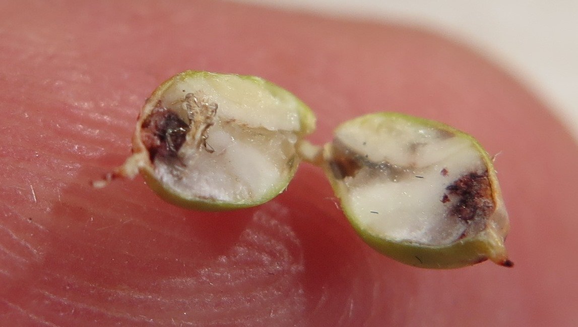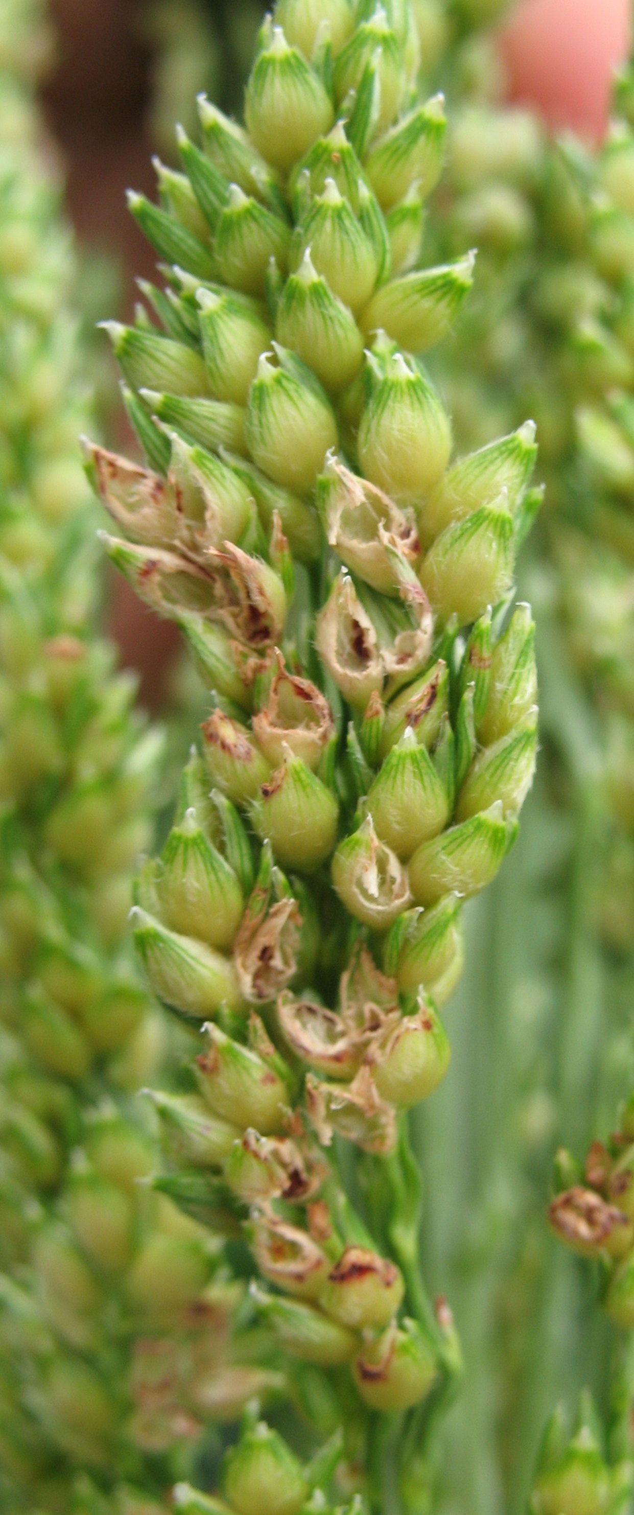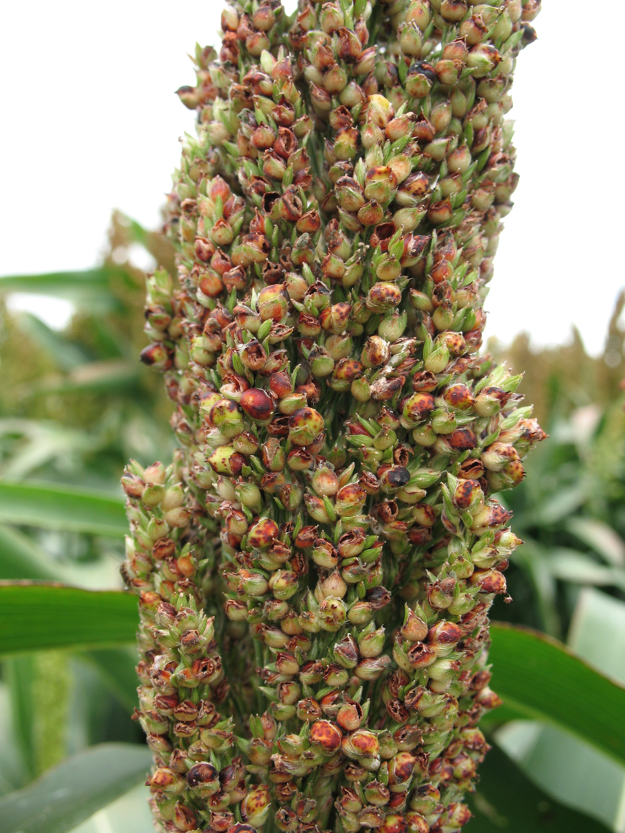 Developing sorghum head showing signs of RGB damage; undeveloped seed, and spotting on developing seed.