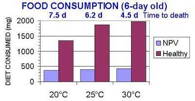 Consumption of artificial diet by healthy and NPV-infected 6-day old caterpillars and time to death from NPV at three temperatures (Data from Chris Monsour).