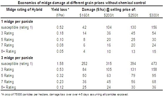 One of the main tools available for managing sorghum midge is midge resistance varieties. The table below shows a rating comparison of potential yield loss under low (1/panicle) and high (3/panicle) midge pressure.