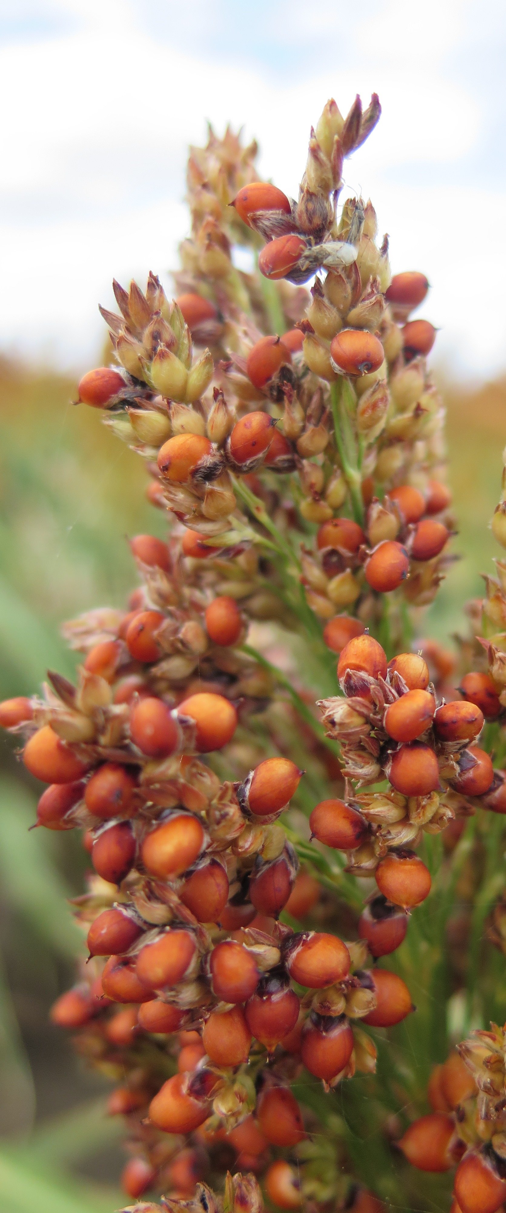 Sorghum head that has not sustained RGB damage during early grain fill, but is now infested with adults; showing full grain and no spotting of seed
