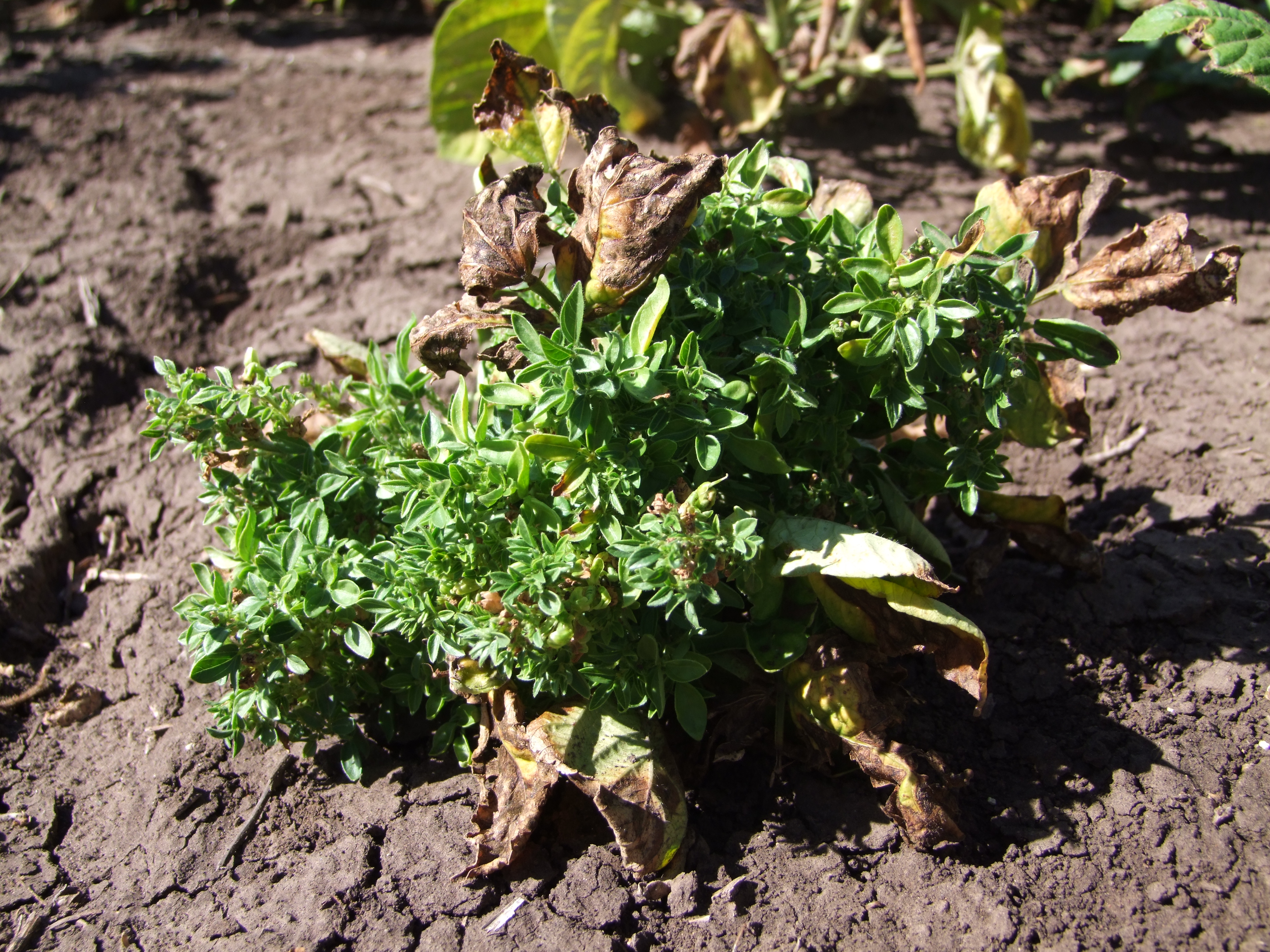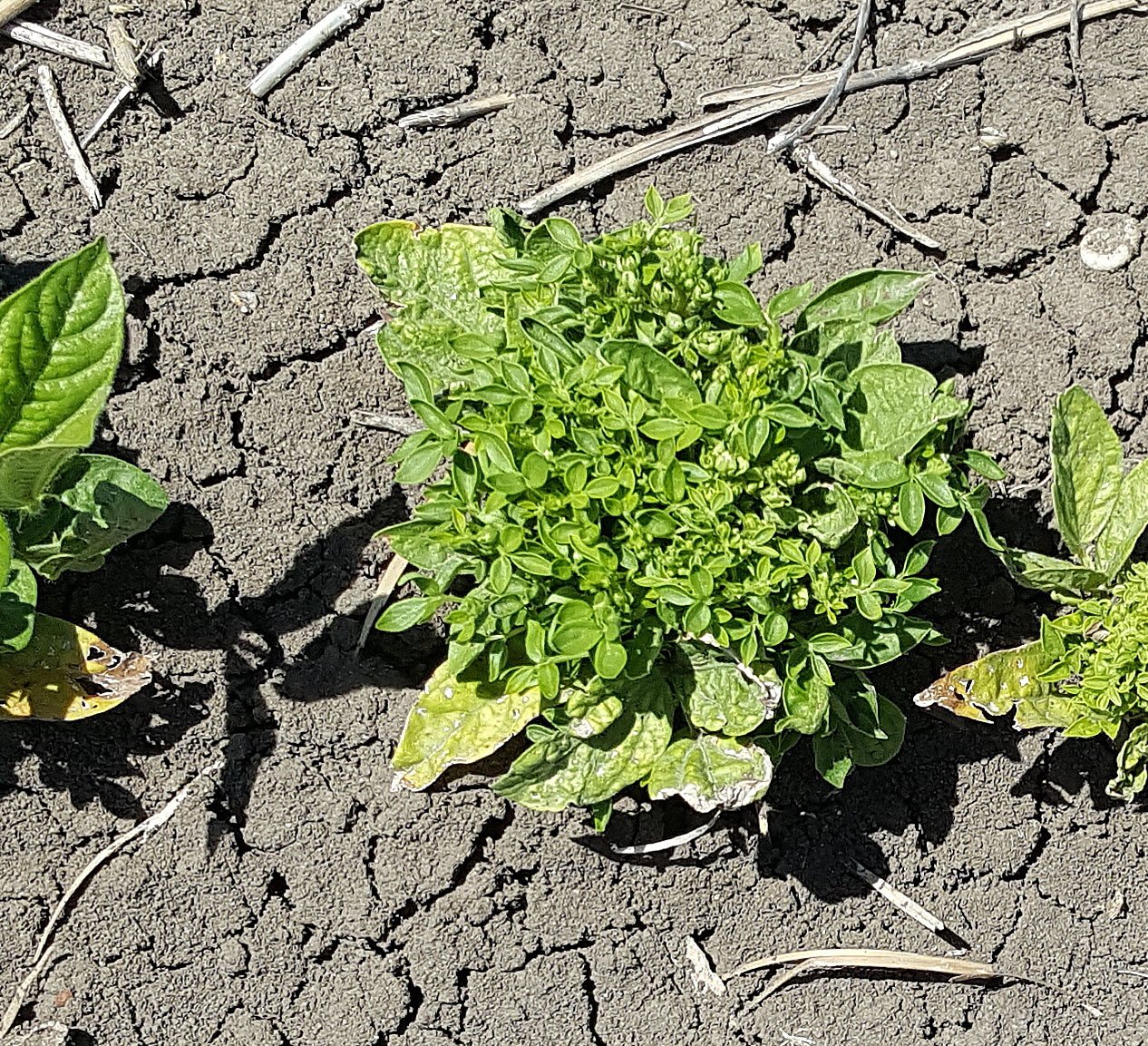 - Severely affected mungbean plant with no prospect of setting pods. About 33% of plants in this crop were similarly affected.