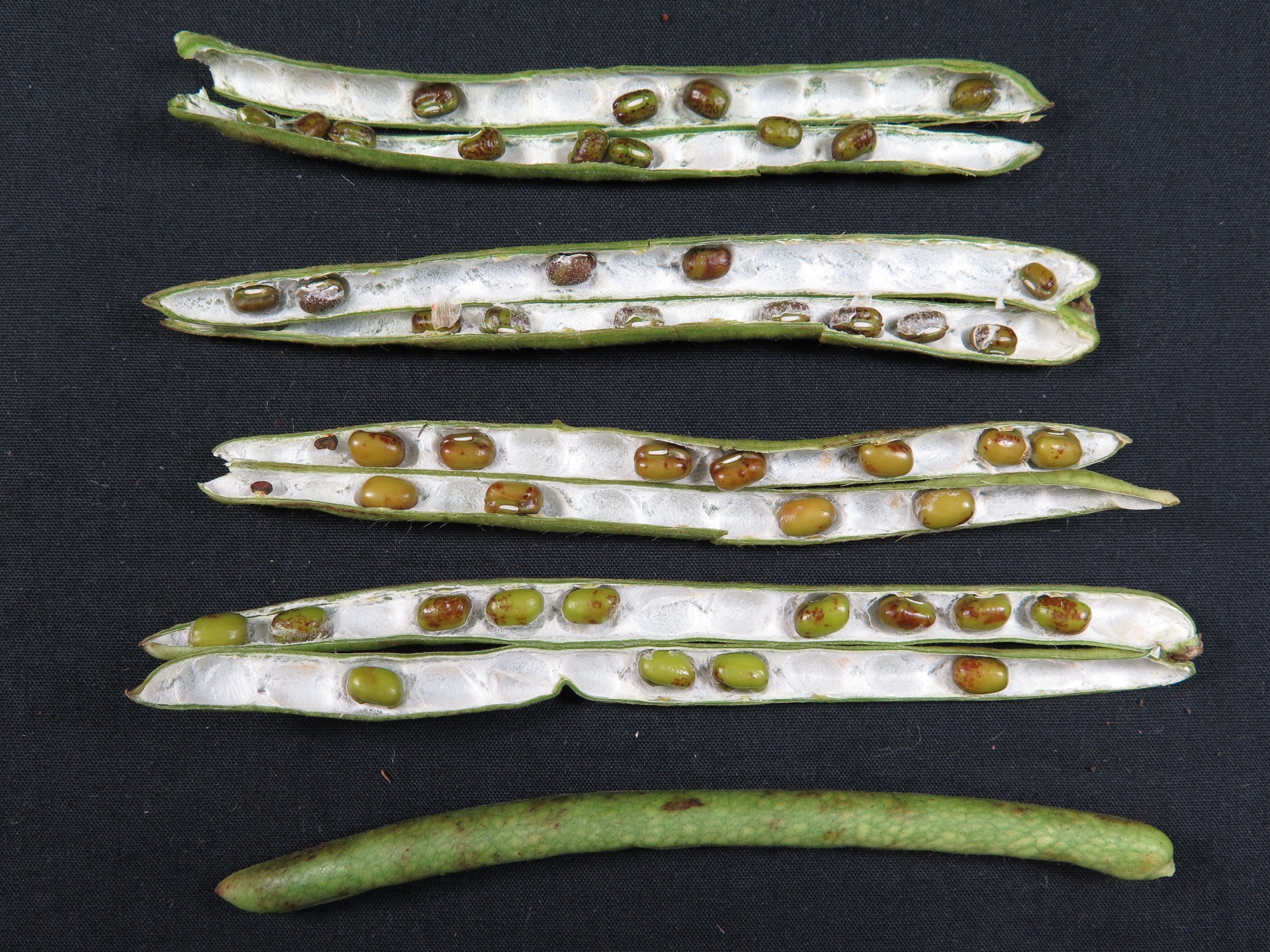 - Puffy pod symptoms in phytoplasma-infected mungbeans with netted pattern on pods and shrivelled, brown seeds.