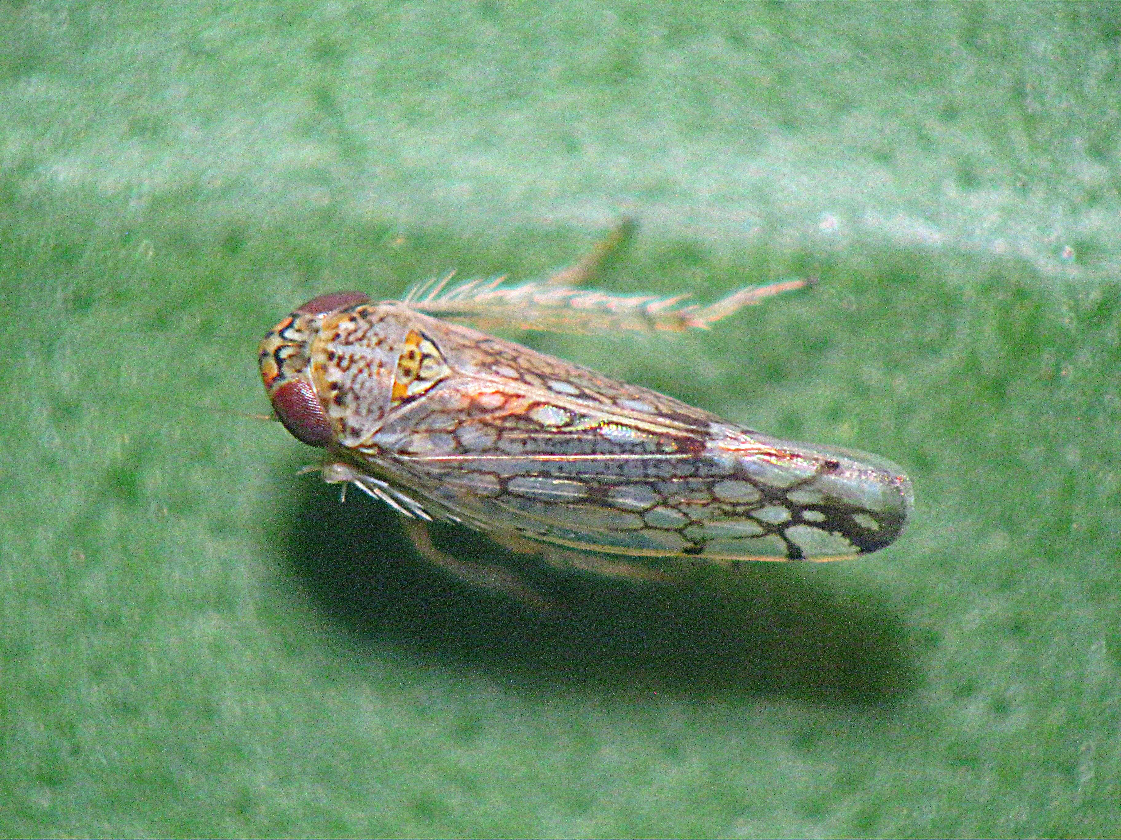 Common brown leaf hopper (3 mm). This is the most likely vector and has been widely observed in summer and winter pulses infected with phytoplasma. Note the distinctive dark reticulated patterns on the wings and body.