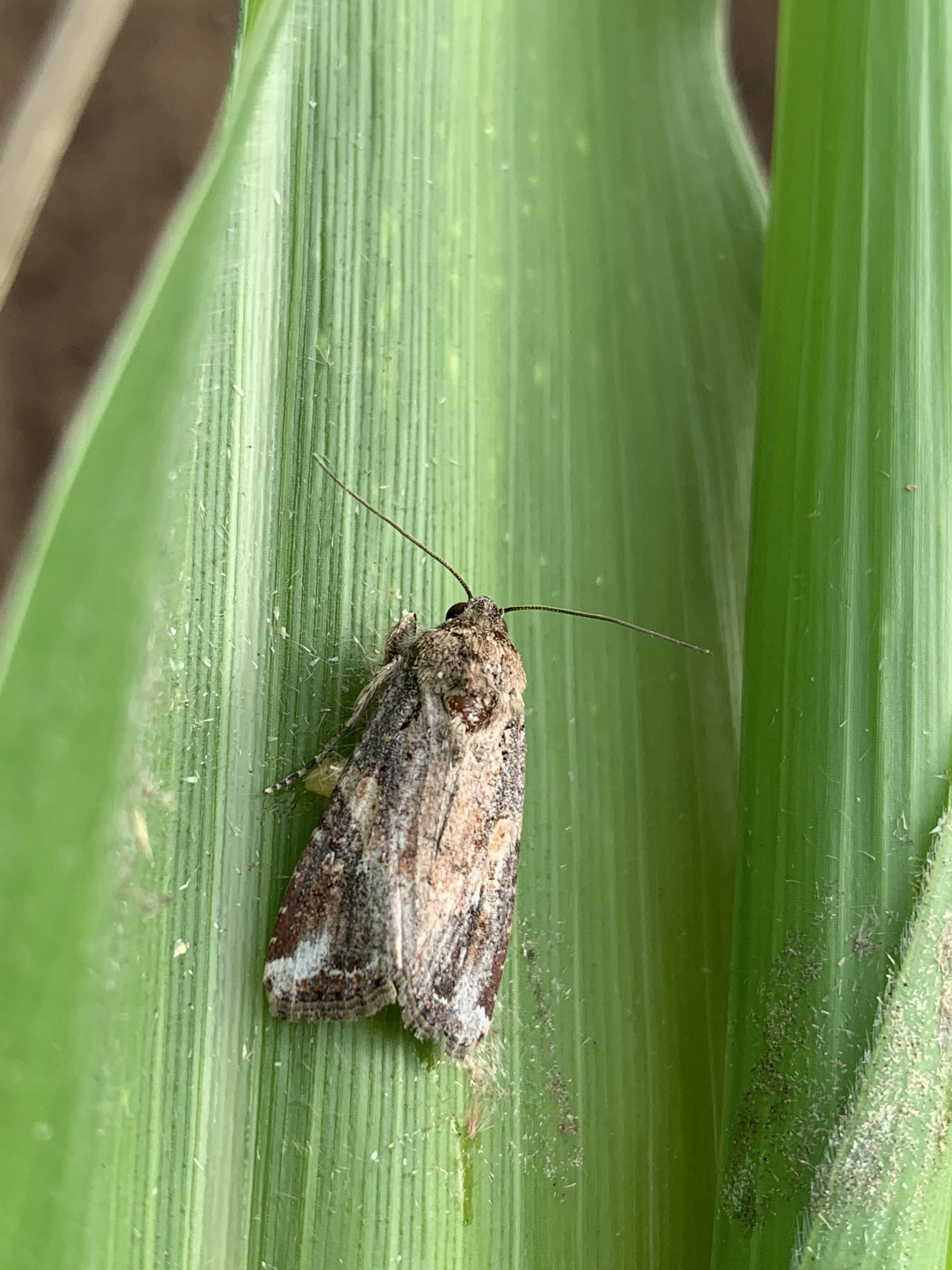 Adult moths are about 16-17mm long, nocturnal, have a mottled brown or grey forewing, a white hind wing, and a wingspan of 32–40 mm. Male fall armyworms are more patterned and have a distinct white spot near the tip of each forewing.