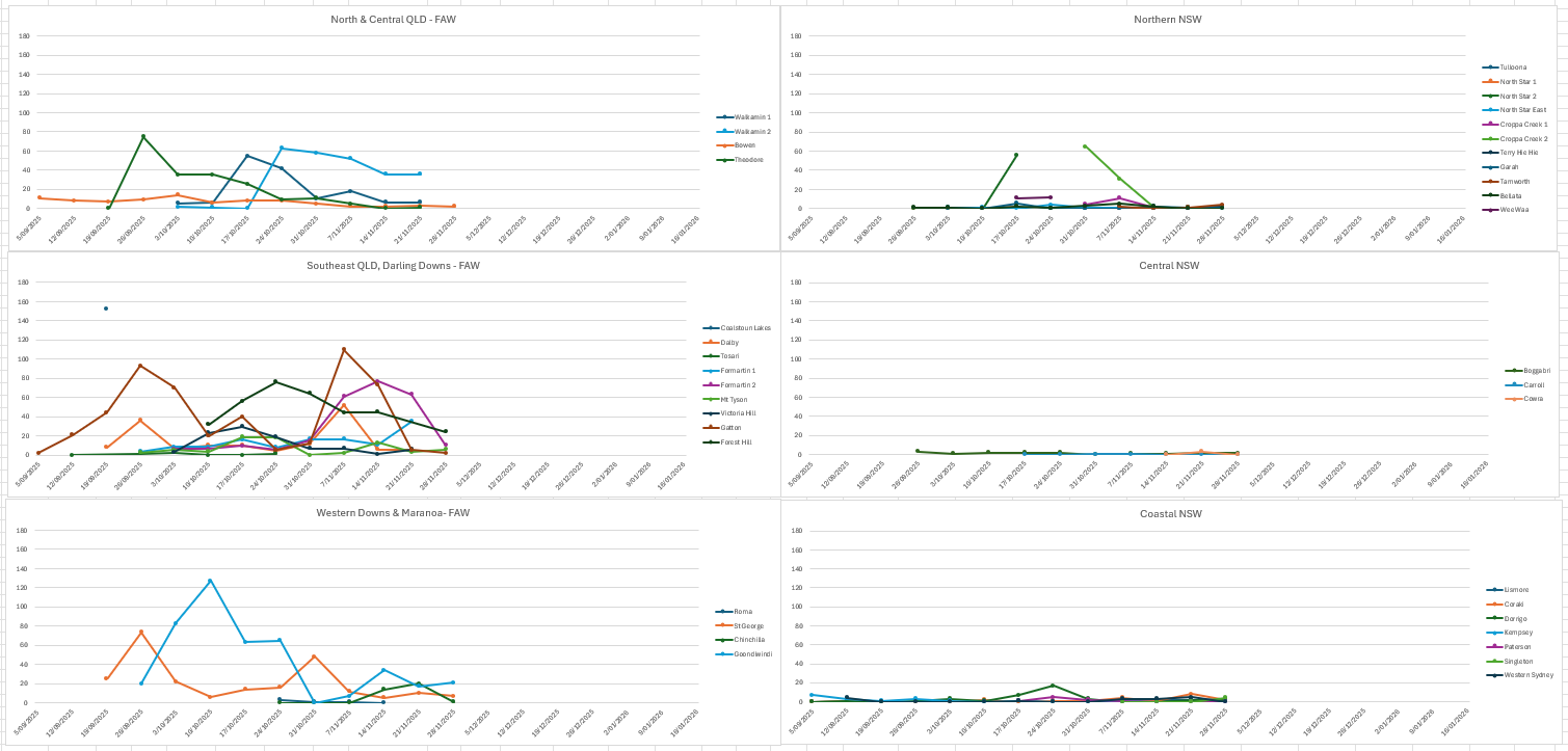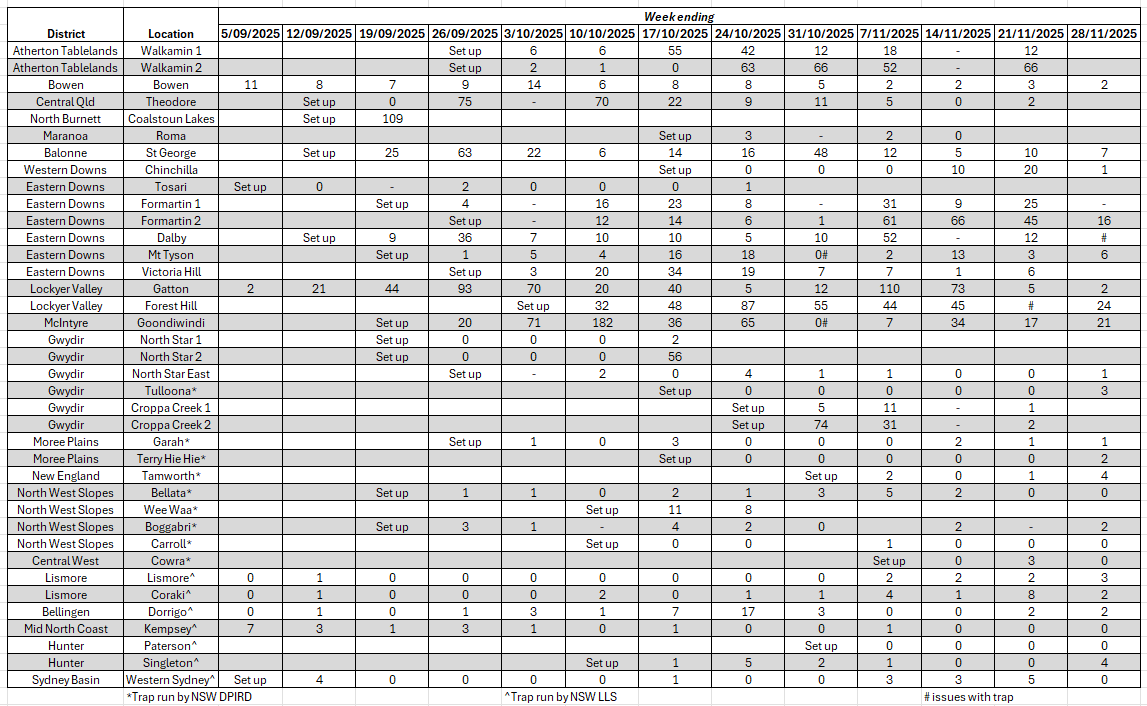 The QLD DPI coordinated Fall armyworm trapping program for 2025 began in mid-August. Results will be added to this page as they become available. The network would not be possible without the help of the many growers and consultants who donate their time to running them. We would also like to thank NSW DPIRD and NSW LLS for contributing weekly moth numbers from NSW.