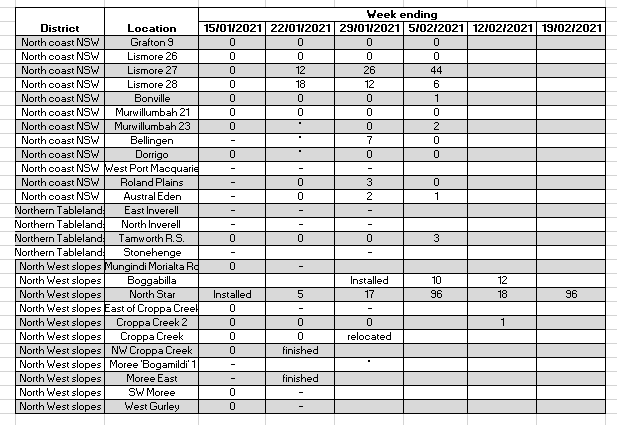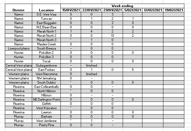 Latest fall armyworm pheromone trap counts in NSW (supplied by NSW DPI & LLS)