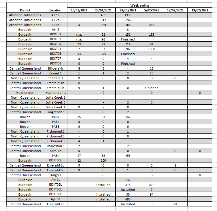 Throughout winter, low levels of FAW moths were detected in the Richmond, Longreach, Emerald and Bundaberg traps, but no larval populations reported. However, large numbers of moths have been detected in Mackay as well as above threshold larval populations.