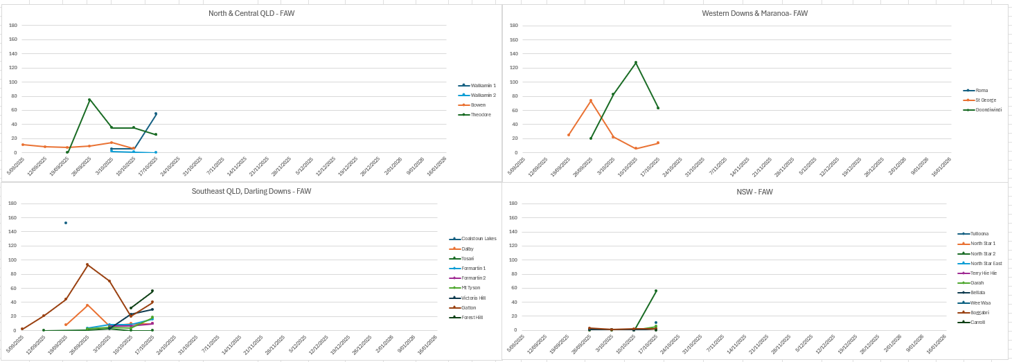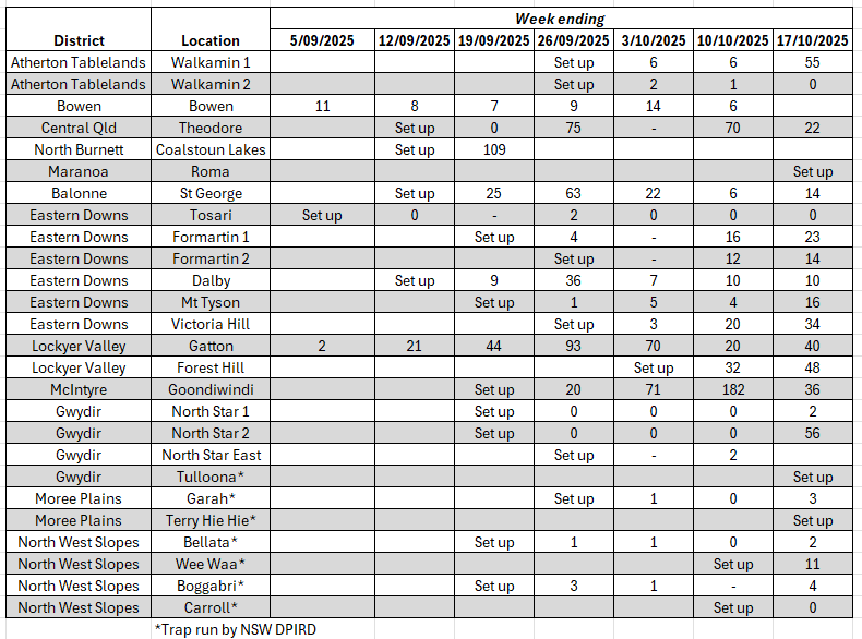 The QLD DPI coordinated Fall armyworm trapping program for 2025 began in mid-August. Results will be added to this page as they become available. The network would not be possible without the help of the many growers and consultants who donate their time to running them.