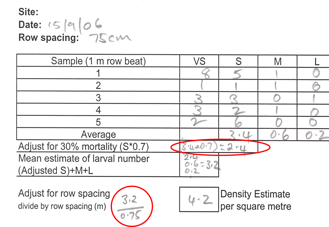 Most thresholds are expressed as pests per square metre (pests/m2). Hence, insect counts in crops with row spacing less than one metre must be converted to pests/m2. To do this, divide the ‘average insect count per row metre’ across all sites by the row spacing in metres. For example, in a crop with 0.75 m (75 cm) row spacing, divide the average pest counts by 0.75.