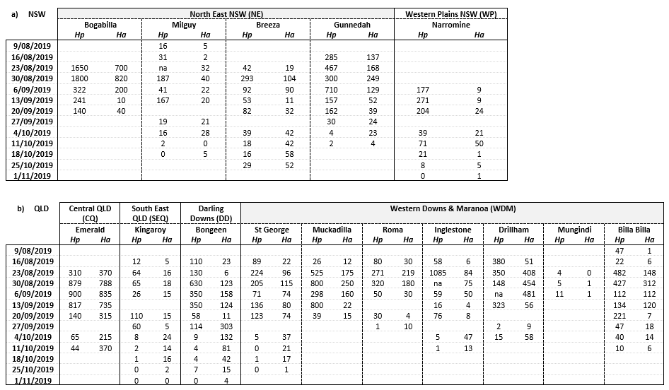 This trap data is only available through the generous cooperation of a number of agronomists and Department staff (QLD DAF, NSW DPI, LLS) across the northern grains region. The 2015 trap watchers were: Jamie Iker (Comet, Rolleston, Capella); Craig Miller (Roma); Hugh Brier (Kingaroy, Byee, Barker’s Creek); Belinda Chase (Nandi), Richard Lloyd (Brookstead); Jamie Street (St George); Bec Raymond (Goondiwindi, Garah); Leigh Norton (North Star); Colin Tann (Narrabri); Bill Manning (Breeza), Sam Simons (Mullaly); Leigh Jenkins (Trangie); Neroli Brennan (Narromine), Patrick McGuinness (Hillston/Hay