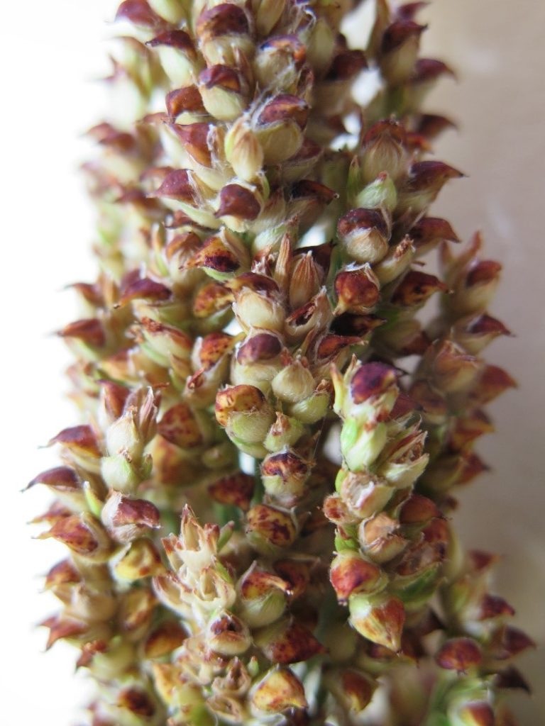 Sorghum is vulnerable to RGB feeding from flowering to physical maturity. RGB feed directly on developing and filling grain, which not only reduces grain weight, but allows entry of pathogens that further deteriorate the grain. Very early damage looks very much like midge damage.