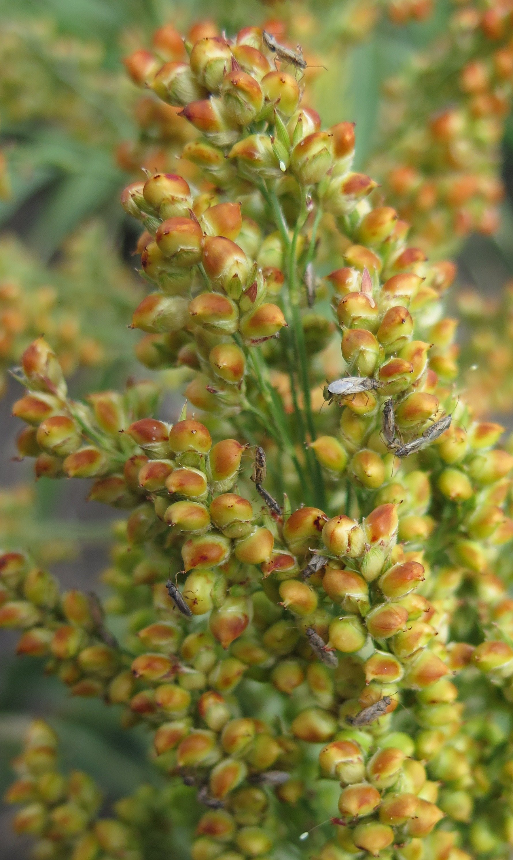 Sorghum head that has not sustained RGB damage during early grain fill, but is now infested with adults; showing full grain and no spotting of seed