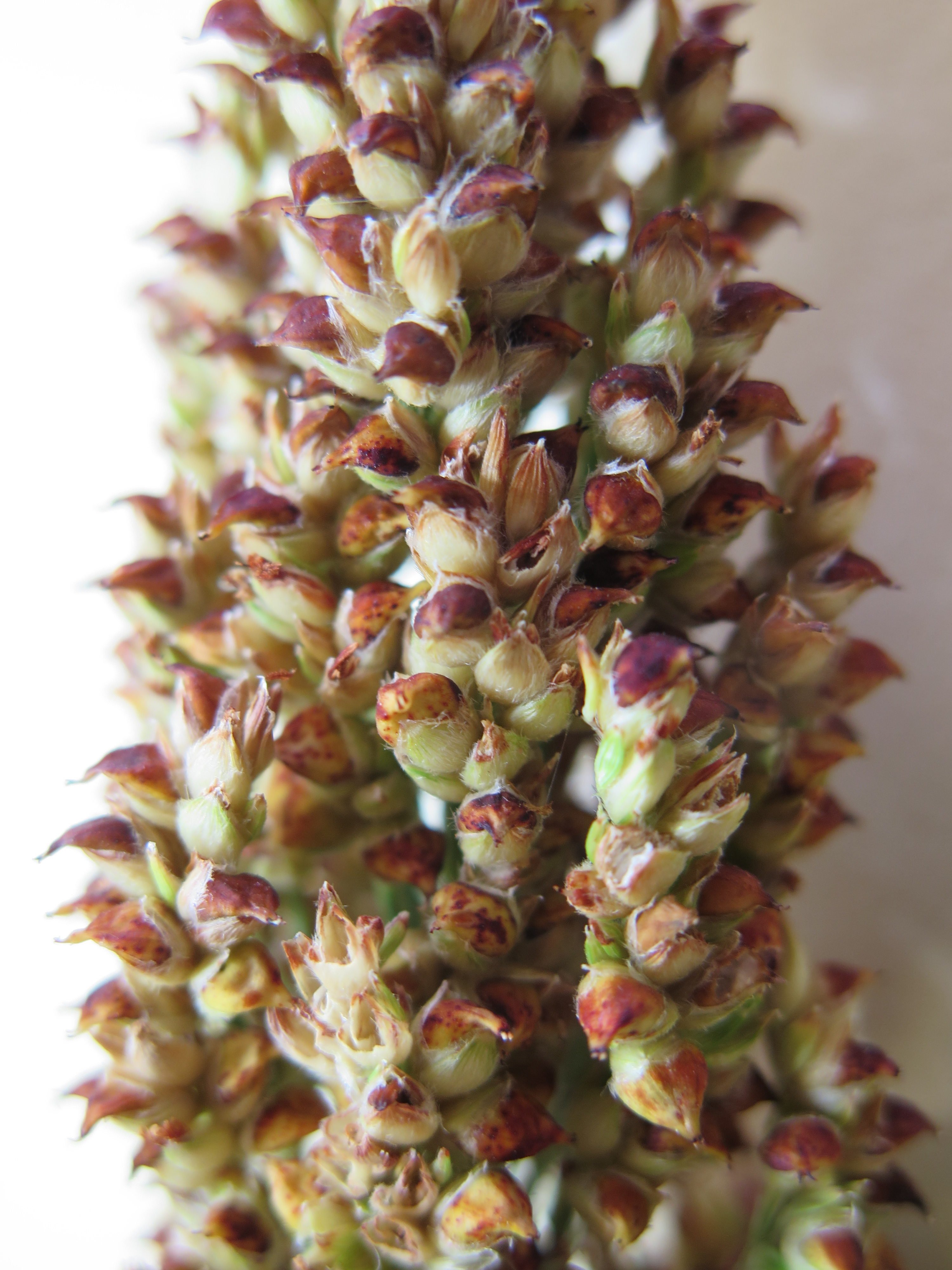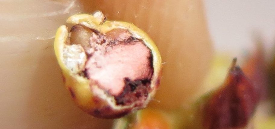 Sorghum head that has had sustained RGB feeding from early grain fill, showing characteristic spotting of the seed