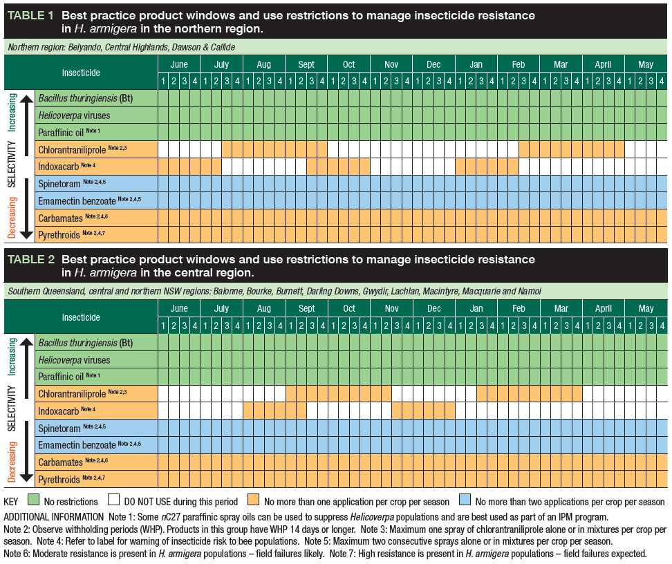 - The RMS Table 2 groups the areas of southern Queensland to the Namoi together because H. armigera moths are highly mobile and have the capacity to move between these areas, potentially increasing the risk of further exposing cohorts of insects previously selected for resistance.