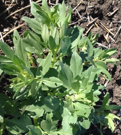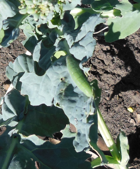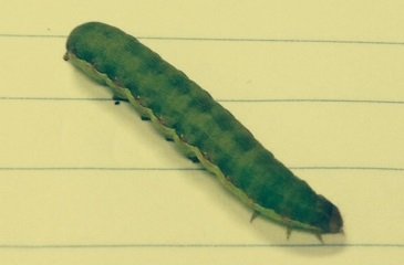 This photograph of Spodoptera exigua damage in faba beans (and the larvae above) were taken in 2014. The defoliation was relatively minor as the Spodoptera numbers were low.