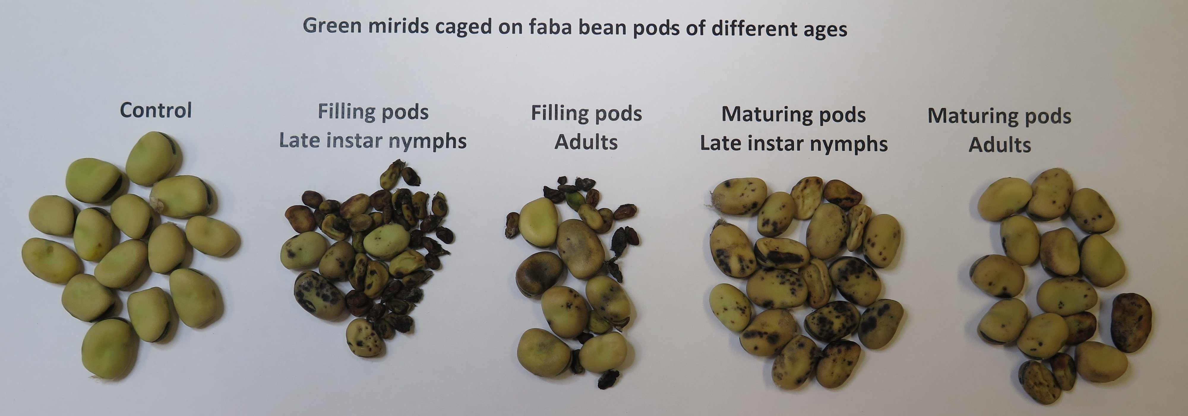 Green mirids (GM) will cause spotting on the seed coat if they feed on seed as it matures in the pod. In faba beans, there is no evidence (dark wet spots, wartiness, and discolouration) evident on the pods or the seed coat whilst the seed is still green. The spotting only appears as the seed coat colours (as the seed dries). Exposing filling pods to green mirids resulted in seed that didn’t fill. It is clear that mirids can impact on both grain quality and yield, depending on the stage of the crop when they are present. As with mungbeans and cotton, late instar nymphs are as damaging as adults.