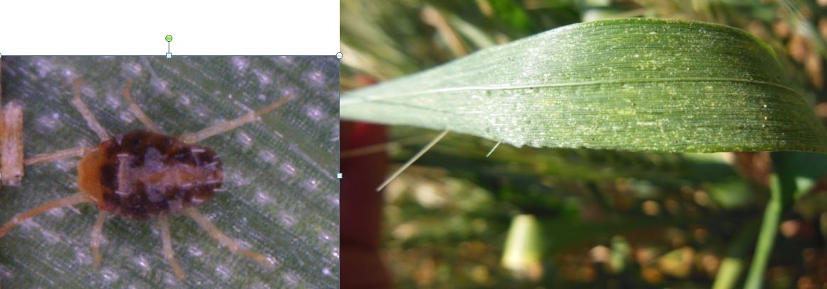 Brown wheat mite (left), and BWM feeding on the underside of a leaf (right). The feeding damage caused (removing cell contents) is very evident on this leaf.