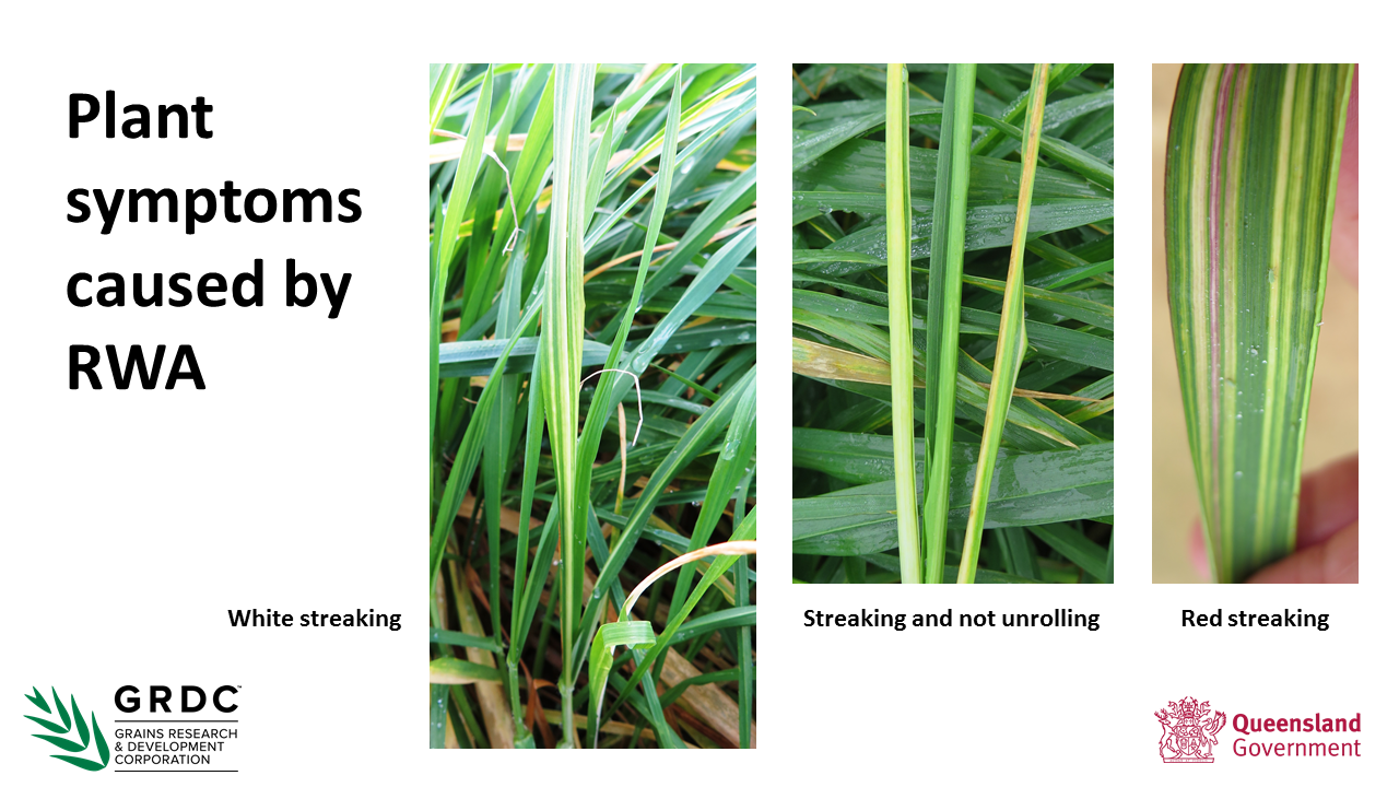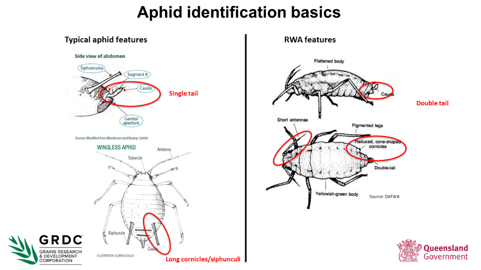 Look for symptoms on plants, and then look for aphids on the affected tillers. RWA can be distinguished from the oat, corn and rose grain aphids by the absence of siphunculi (exhaust pipes at the rear), the presence of a double cauda (tail), and short antennae.