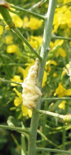 In the northern regions, GPA and turnip aphid tend to colonise the lower leaves and populations typically decline as temperatures warm up. It is the cabbage aphid that tends to predominate through late winter and spring on the terminals and the podding racemes. Cabbage aphid can also occur in high densities on the leaves, particularly prior to bolting. There is a suite of natural enemies that will attack aphids in canola (and other crops), including the fungal disease and ladybird beetle larva shown here.