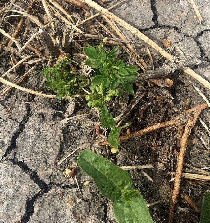 One unusual report has been in post-harvest mungbeans (see image below) at Warra, where phytoplasma symptoms were observed in 10% of regrowth from the standing mungbean stubble. As these infected plants are a potential source of infection for surrounding mungbean crops, this post-harvest crop will be sprayed out with herbicide to stop transmission to other plants.