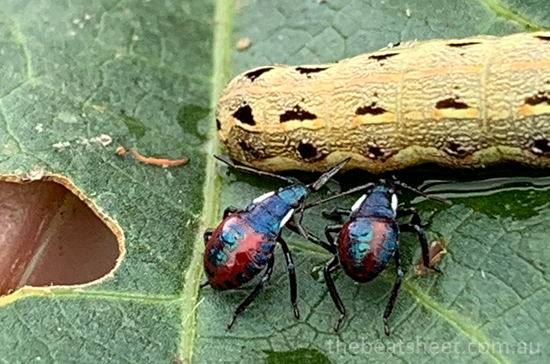 - Predatory bug nymphs attacking cluster caterpillar larva